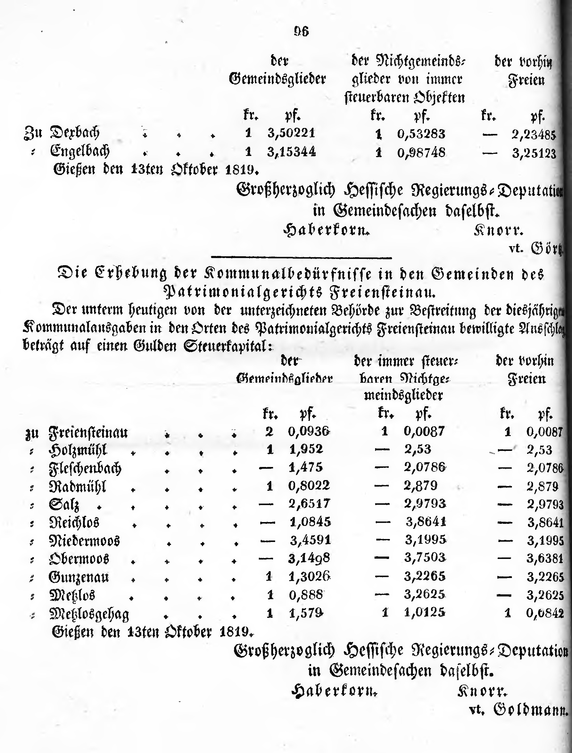 Der unterm heutigen von der unterzeichneten Behörde zur Bestreitung der diesjährigen Kommunalausgaben in den Orten des Patrimonialgerichts Freiensteinau bewilligte Ausschlag beträgt auf einen Gulden Steuerkapital: