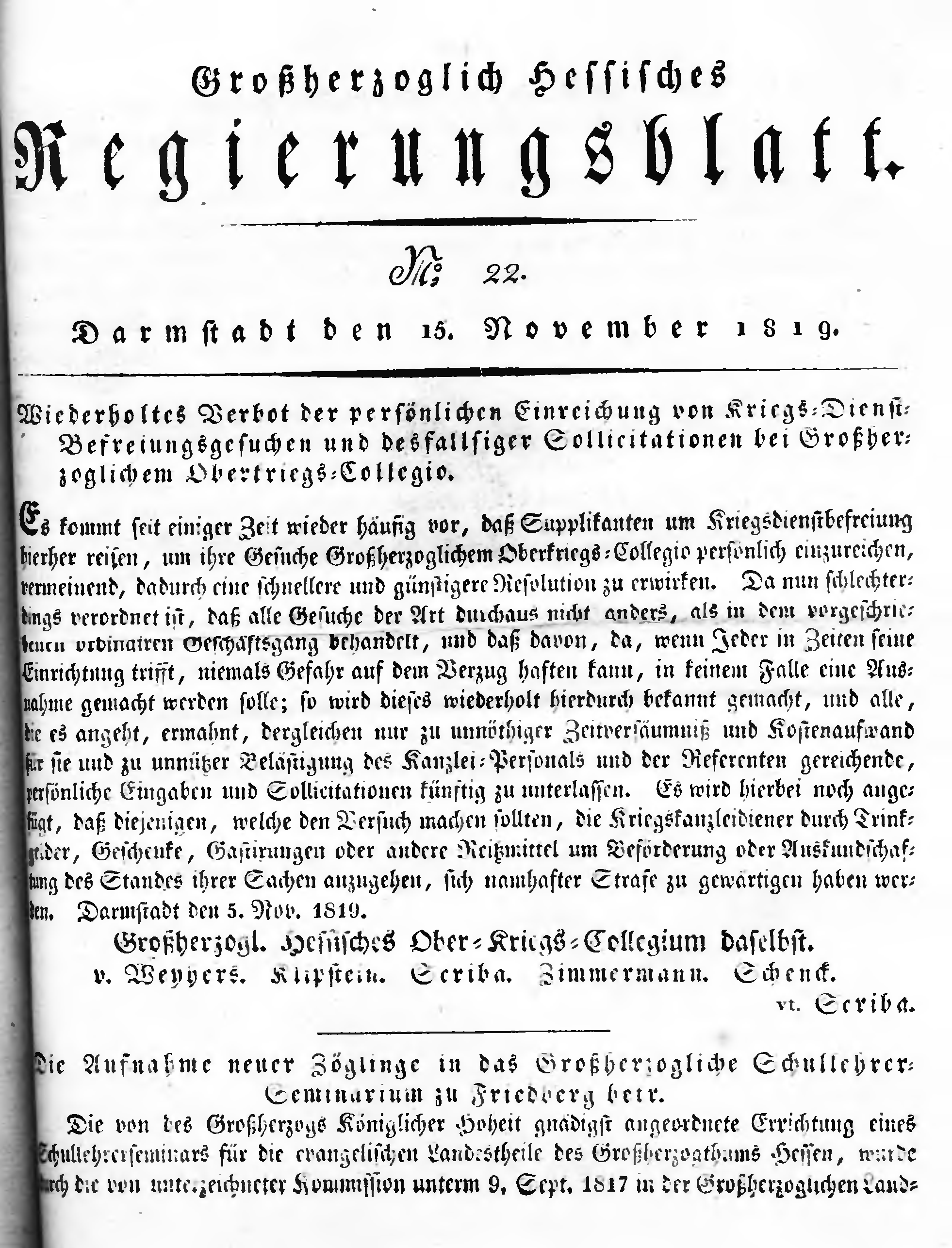 Es kommt seit einiger Zeit wieder häufig vor, daß Supplikanten um Kriegsdienstbefreiung hierher reisen , um ihre Gesuche Großherzoglichem Oberkriegs-Collegio persönlich einzureichen, vermeinend, dadurch eine schnellere und günstigere Resolution zu erwirken. Da nun schlechterdings verordnet ist, daß alle Gesuche der Art durchaus nicht anders, als in dem vorgeschriebenen ordinairen Geschäftsgang behandelt, und daß davon, da, wenn Jeder in Zeiten seine Einrichtung trifft, niemals Gefahr auf dem Verzug haften kann, in keinem Falle eine Ausnahme gemacht werden solle; so wird dieses wiederholt hierdurch bekannt gemacht, und alle, die es angeht, ermahnt, dergleichen nur zu unnöthiger Zeitversäumniß und Kostenaufwand für sie und zu unnützer Belästigung des Kanzlei-Personals und der Referenten gereichende, persönliche Eingaben und Sollicitationen künftig zu unterlassen. Es wird hierbei noch angefügt, daß diejenigen, welche den Versuch machen sollten, die Kriegskanzleidiener durch Trinkgelder, Geschenke, Gastirungen oder andere Reitzmittel um Beförderung oder Auskundschaftung des Standes ihrer Sachen anzugehen, sich namhafter Strafe zu gewärtigen haben werden. Darmstadt den 5. Nov. 1819.