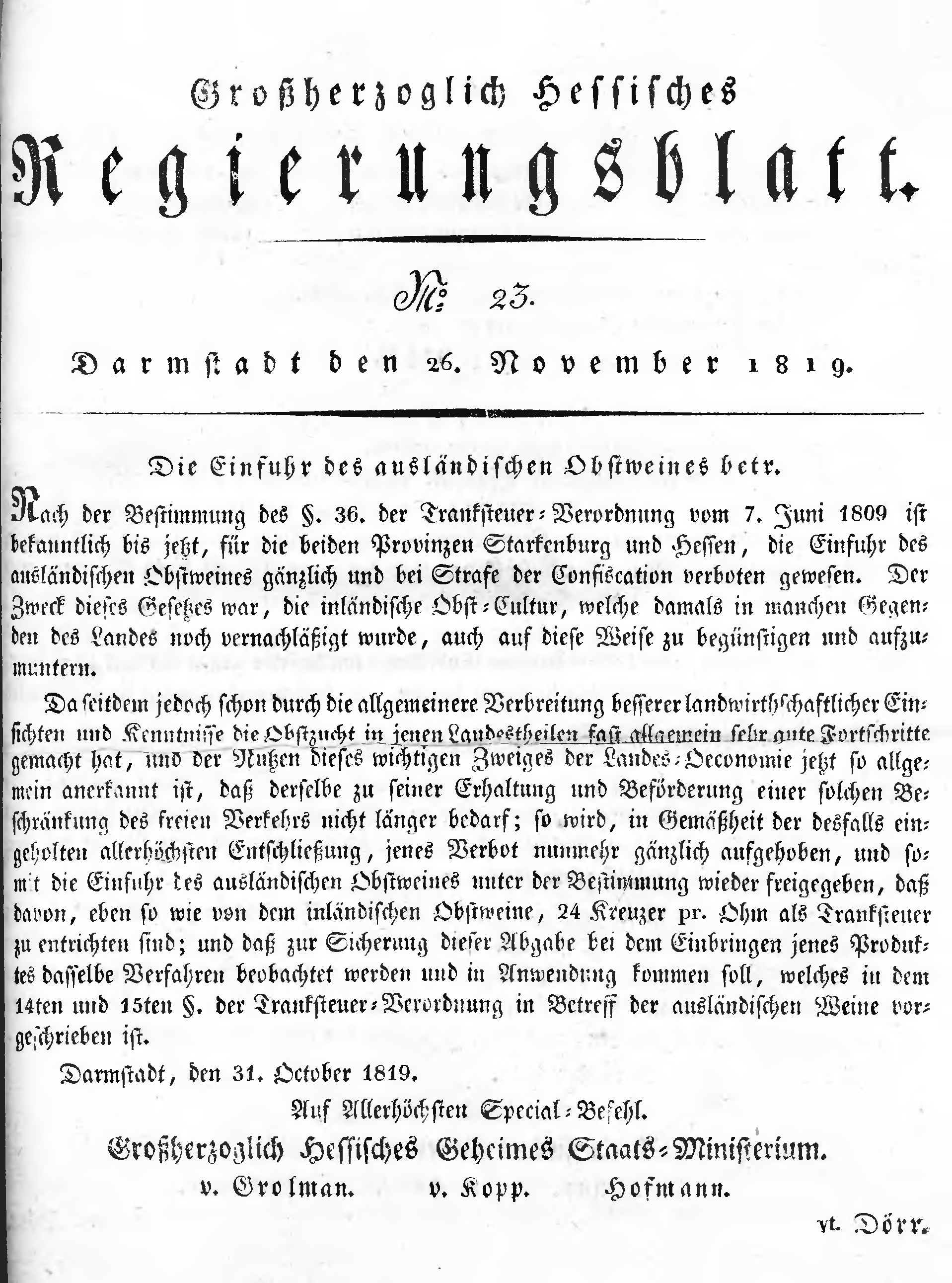 Nach der Bestimmung des §. 36. der Tranksteuer-Verordnung vom 7. Juni 1809 ist bekanntlich bis jetzt, für die beiden Provinzen Starkenburg und Hessen, die Einfuhr des ausländischen Obstweines gänzlich und bei Strafe der Confiscation verboten gewesen. Der Zweck dieses Gesetzes war, die inländische Obst-Cultur, welche damals in manchen Gegenden des Landes noch vernachläßigt wurde, auch auf diese Weise zu begünstigen und aufzumuntern.