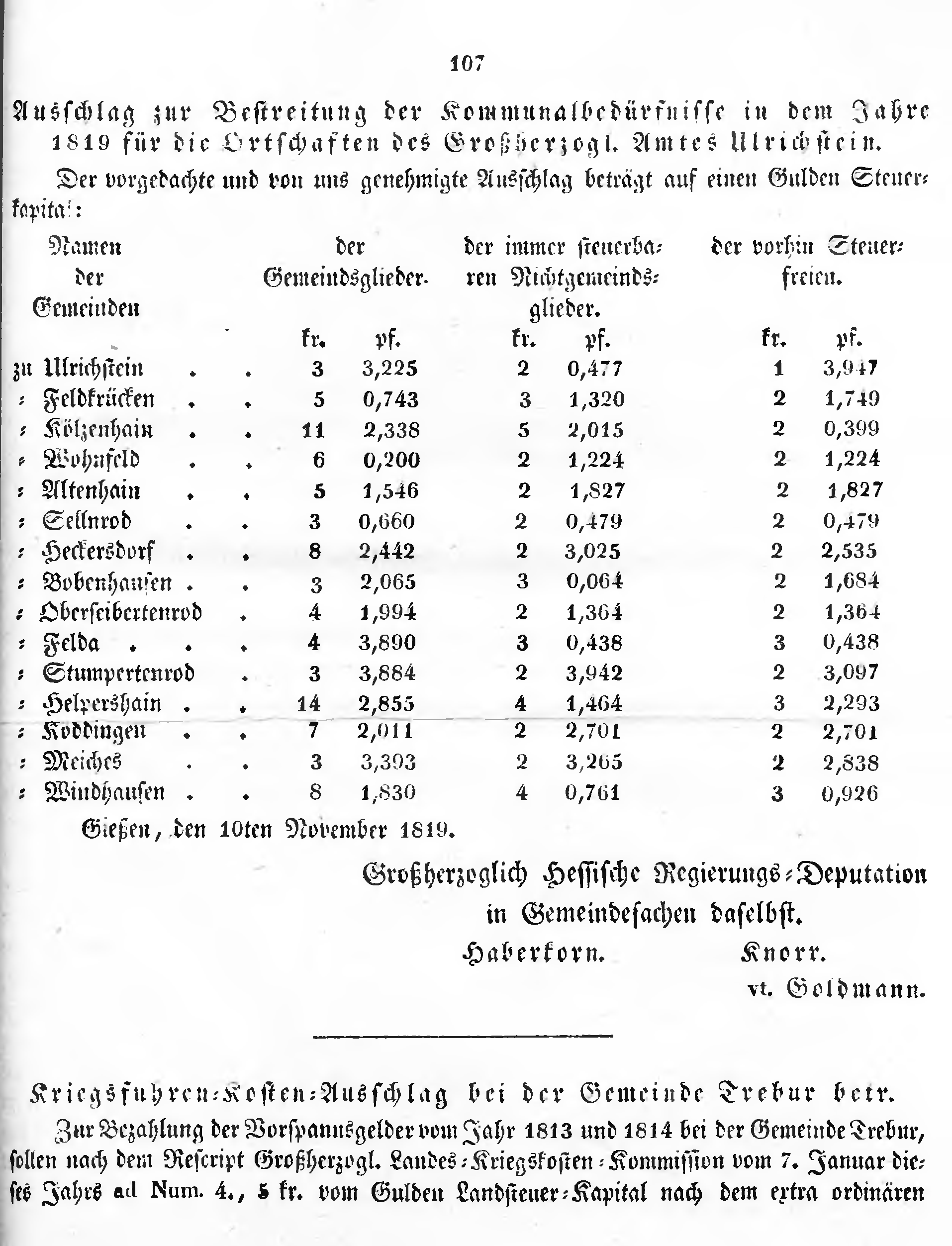 Ausschlag zur Bestreitung der Kommunalbedürfnisse in dem Jahre 1819 für die Ortschaften des Großherzogl. Amtes Ulrichstein.