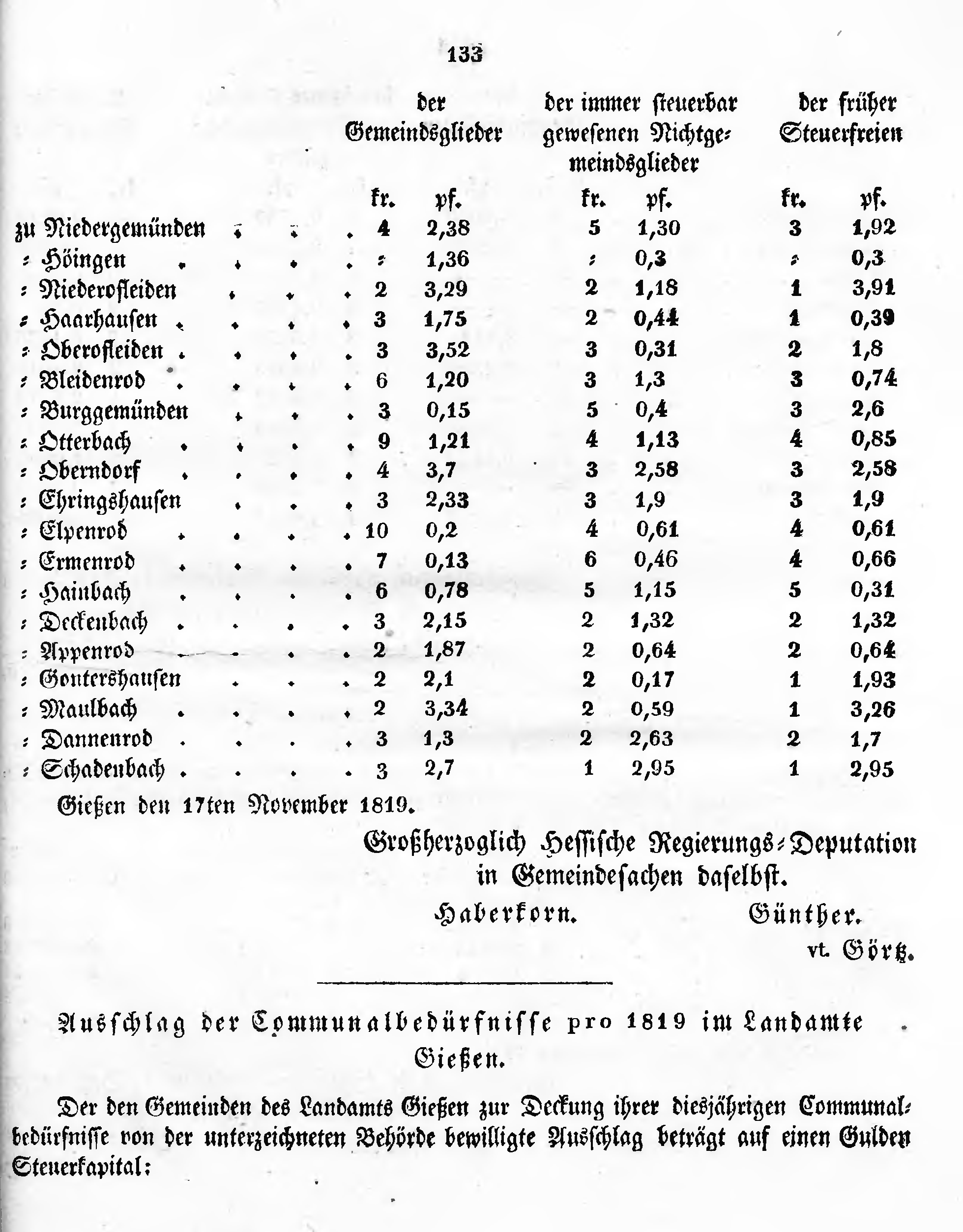 Ausschlag der Communalbedürfnisse pro 1819 im Landamte Gießen.