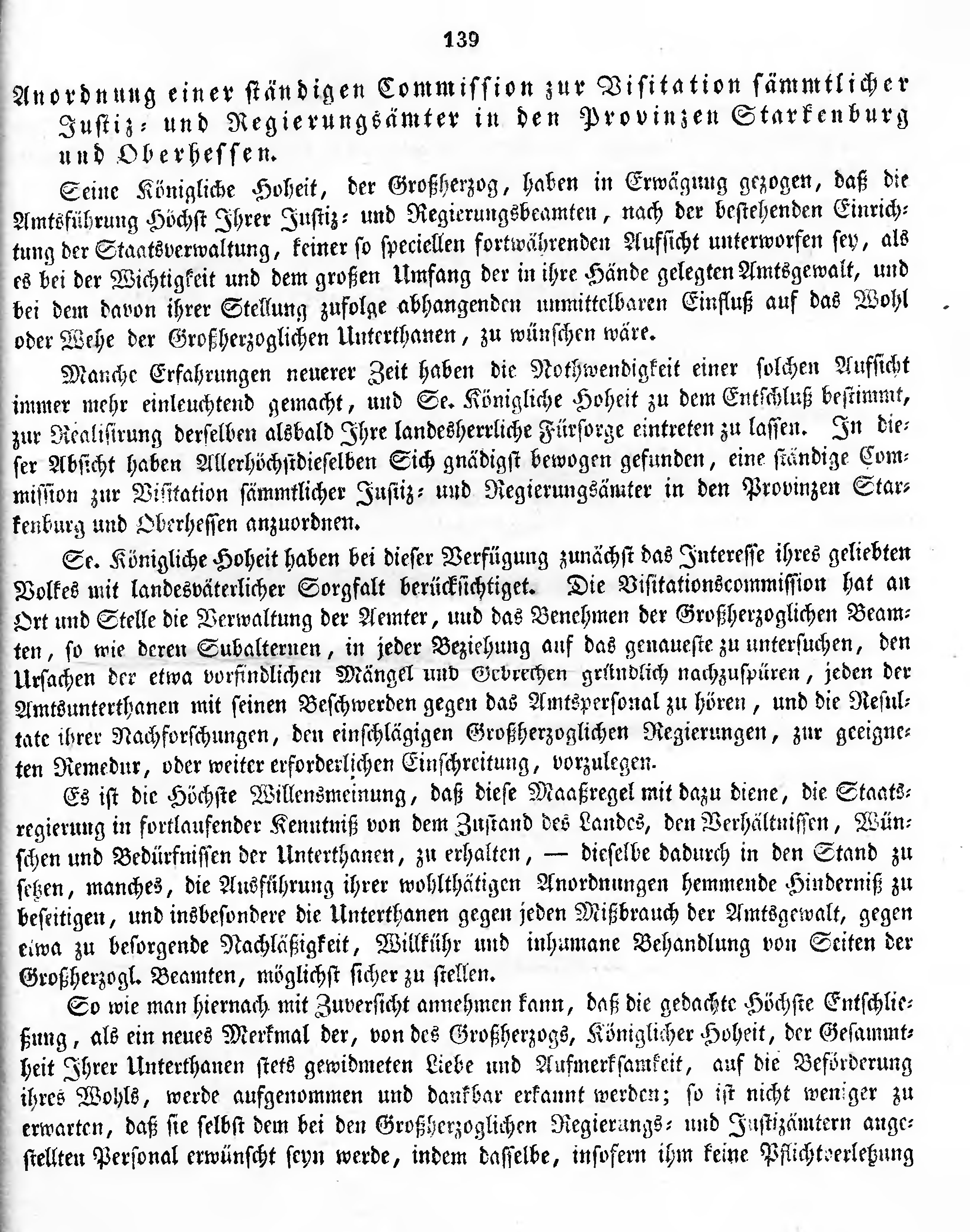 Manche Erfahrungen neuerer Zeit haben die Nothwendigkeit einer solchen Aufsicht immer mehr einleuchtend gemacht, und Se. Königliche Hoheit zu dem Entschluß bestimmt, zur Realisirung derselben alsbald Ihre landesherrliche Fürsorge eintreten zu lassen. In dieser Absicht haben Allerhöchstdieselben Sich gnädigst bewogen gefunden, eine ständige Commission zur Visitation sämmtlicher Justiz- und Regierungsämter in den Provinzen Starkenburg und Oberhessen anzuordnen.
