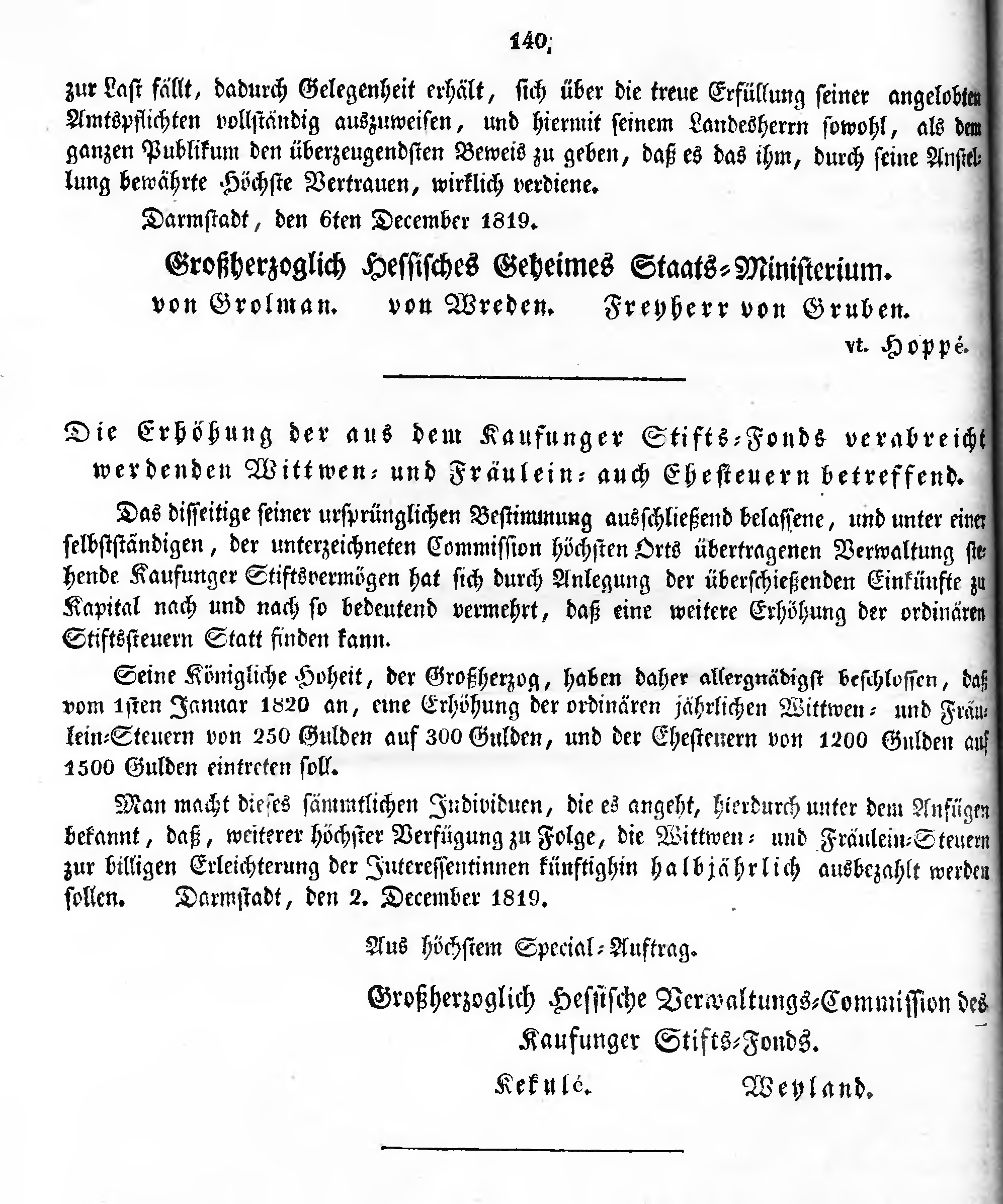 Seine Königliche Hoheit, der Großherzog, haben daher allergnädigst beschlossen, daß vom 1sten Januar 1820 an, eine Erhöhung der ordinären jährlichen Wittwen- und Fräulein-Steuern von 250 Gulden auf 300 Gulden, und der Ehesteuern von 1200 Gulden auf 1500 Gulden eintreten soll.