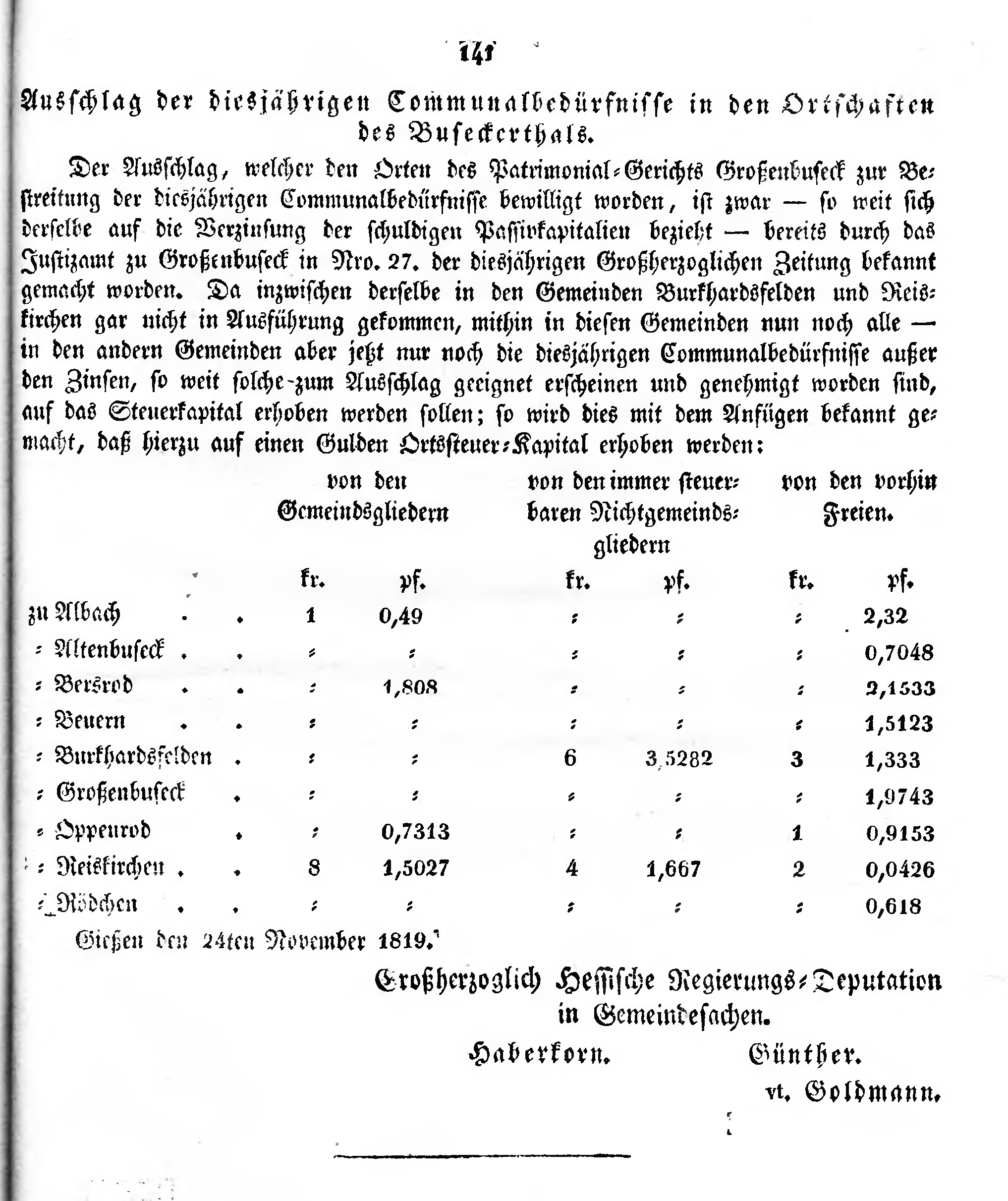 Der Ausschlag, welcher den Orten des Patrimonial-Gerichts Großenbuseck zur Bestreitung der diesjährigen Communalbedürfnisse bewilligt worden, ist zwar - so weit sich derselbe auf die Verzinsung der schuldigen Passivkapitalien bezieht - bereits durch das Justizamt zu Großenbuseck in Nro. 27. der diesjährigen Großherzoglichen Zeitung bekannt gemacht worden. Da inzwischen derselbe in den Gemeinden Burkhardsfelden und Reiskirchen gar nicht in Ausführung gekommen, mithin in diesen Gemeinden nun noch alle - in den andern Gemeinden aber jetzt nur noch die diesjährigen Communalbedürfnisse außer den Zinsen, so weit solche zum Ausschlag geeignet erscheinen und genehmigt worden sind, auf das Steuerkapital erhoben werden sollen; so wird dies mit dem Anfügen bekannt gemacht, daß hierzu auf einen Gulden Ortssteuer-Kapital erhoben werden: