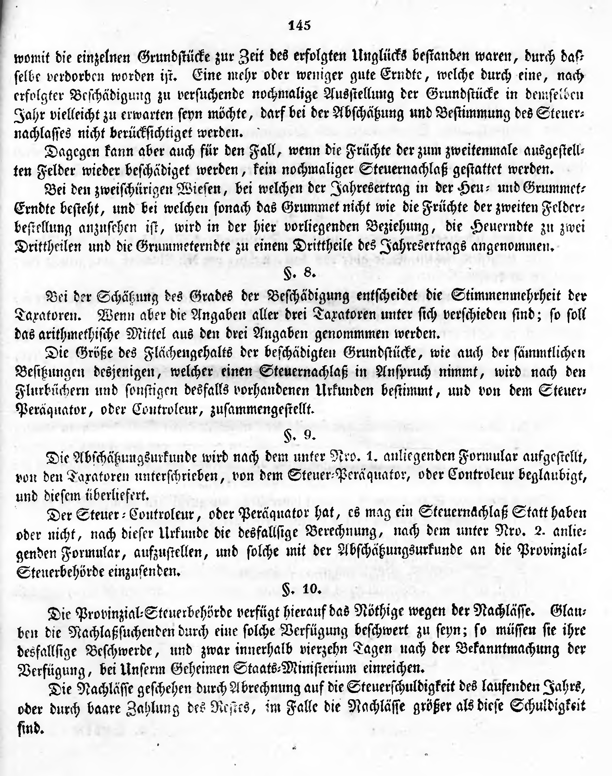 Der Steuer-Controleur, oder Peräquator hat, es mag ein Steuernachlaß Statt haben oder nicht, nach dieser Urkunde die desfallsige Berechnung, nach dem unter Nro. 2. anliegenden Formular, auszustellen, und solche mit der Abschätzungsurkunde an die Provinzial-Steuerbehörde einzusenden.