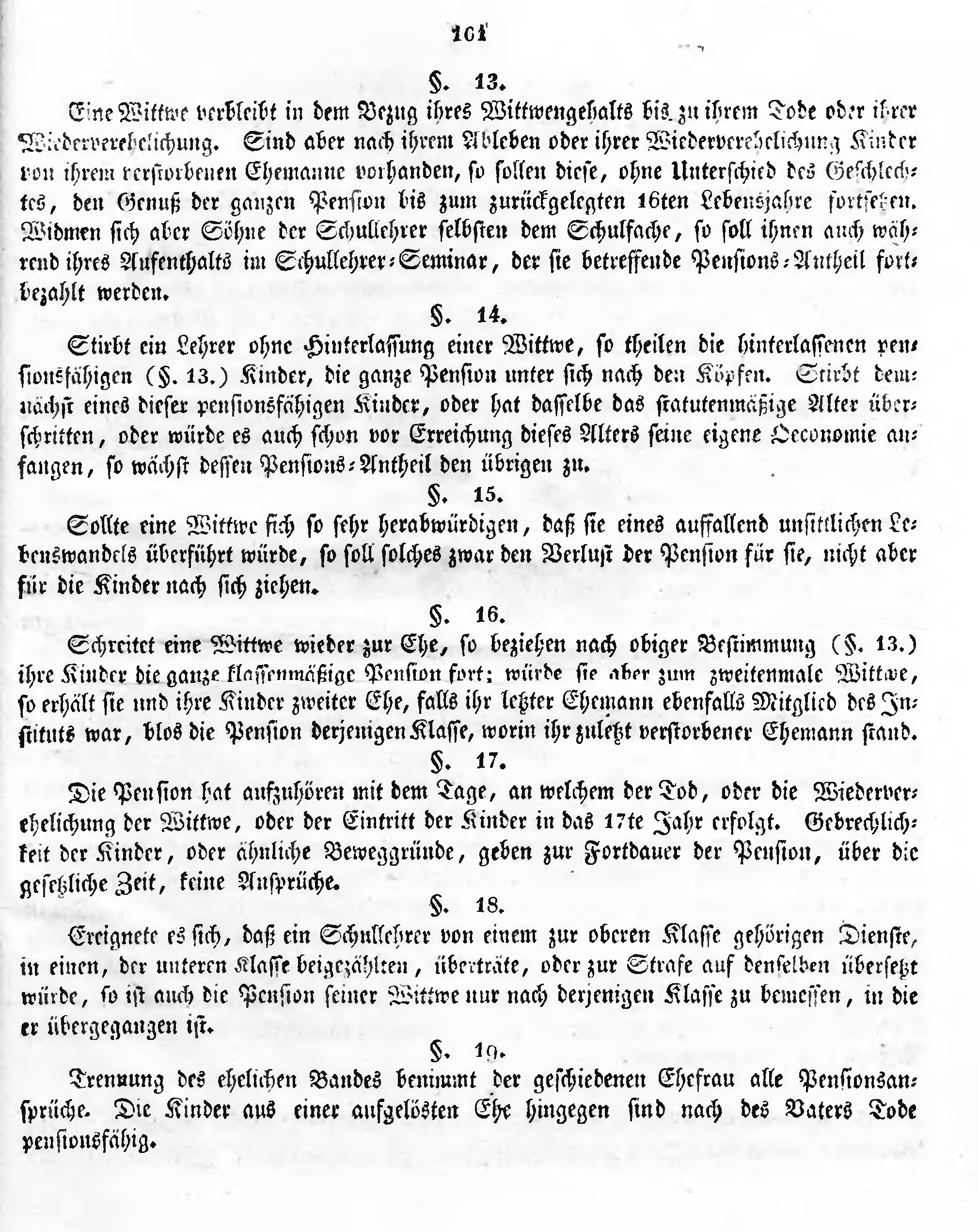 Eine Wittwe verbleibt in dem Bezug ihres Wittwengehalts bis zu ihrem Tode oder ihrer Wiederverehelichung. Sind aber nach ihrem Ableben oder ihrer Wiederverehelichung Kinder von ihrem verstorbenen Ehemanne vorhanden, so sollen diese, ohne Unterschied des Geschlechtes, den Genuß der ganzen Pension bis zum zurückgelegten 16ten Lebensjahre fortsetzen. Widmen sich aber Söhne der Schullehrer selbsten dem Schulfache, so soll ihnen auch während ihres Aufenthalts im Schullehrer-Seminar, der sie betreffende Pensions-Antheil fortbezahlt werden.
