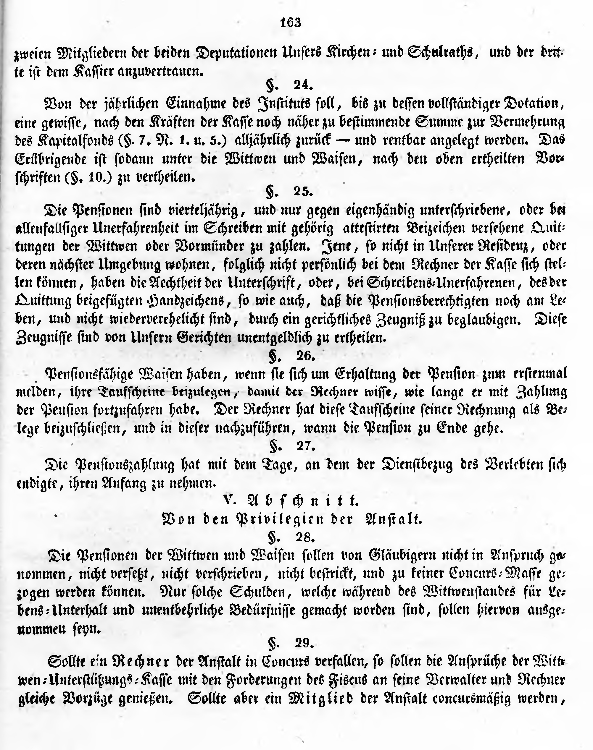 Sollte ein Rechner der Anstalt in Concurs verfallen, so sollen die Ansprüche der Wittwen-Unterstützungs-Kasse mit den Forderungen des Fiscus an seine Verwalter und Rechner gleiche Vorzüge genießen. Sollte aber ein Mitglied der Anstalt concursmäßig werden,