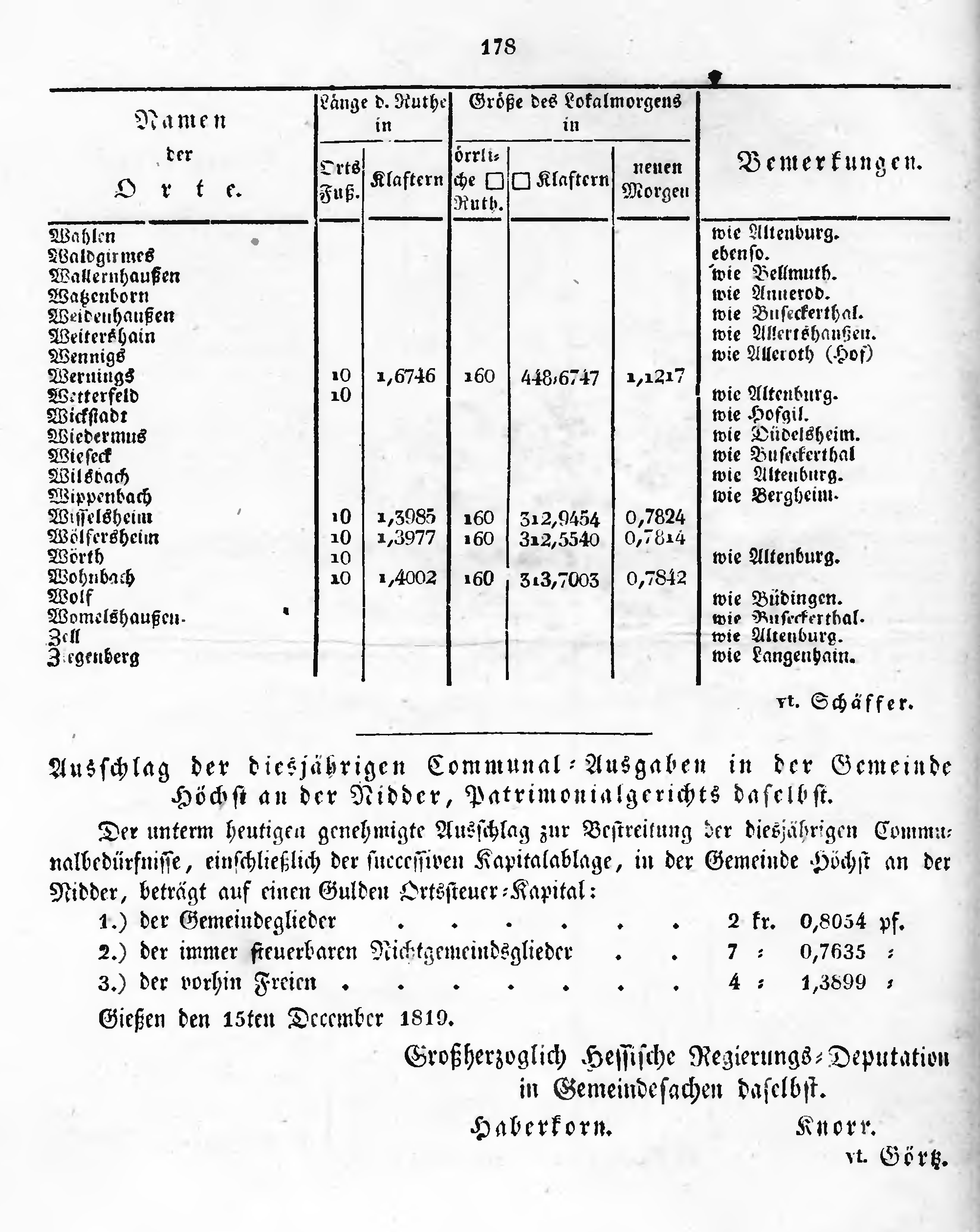 Der unterm heutigen genehmigte Ausschlag zur Bestreitung der diesjährigen Communalbedürfnisse, einschließlich der successiven Kapitalablage, in der Gemeinde Höchst an der Nidder, beträgt auf einen Gulden Ortssteuer-Kapital:
