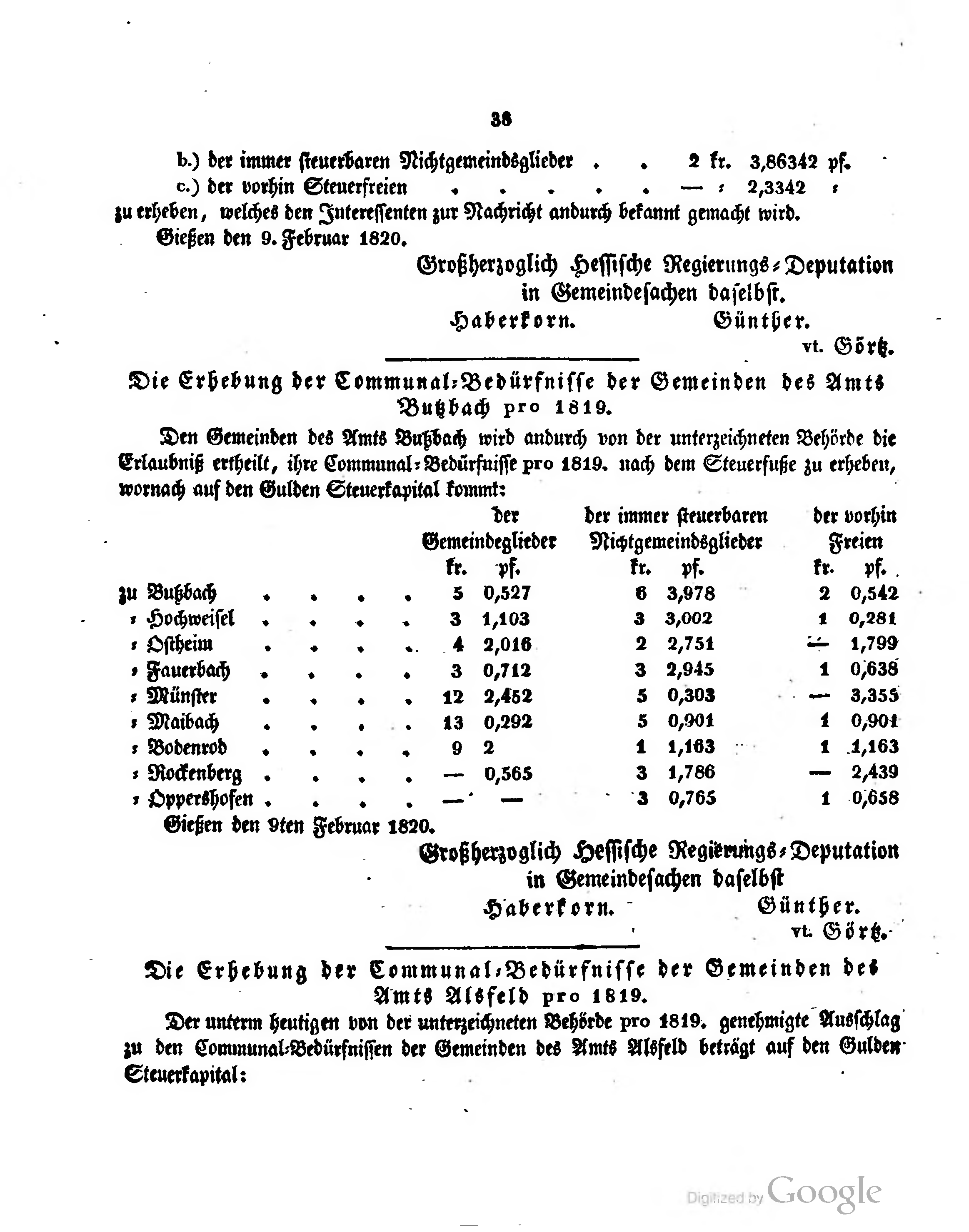 Den Gemeinden des Amts Butzbach wird andurch von der unterzeichneten Behörde die Erlaubniß ertheilt, ihre Communal-Bedürfnisse pro 1819. nach dem Steuerfuße zu erheben, wornach auf den Gulden Steuerkapital kommt: