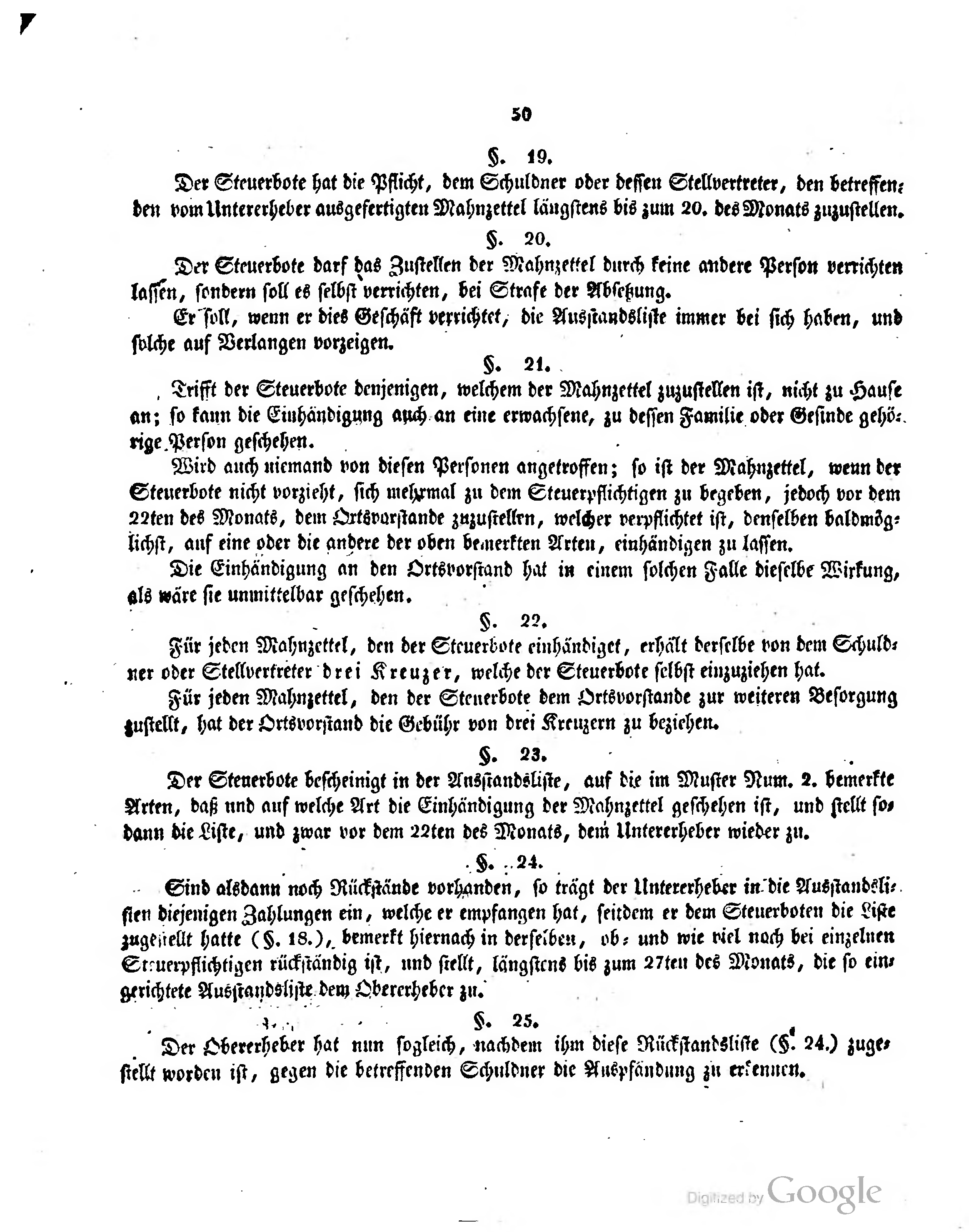 Für jeden Mahnzettel, den der Steuerbote einhändiget, erhält derselbe von dem Schuldner oder Stellvertreter drei Kreuzer, welche der Steuerbote selbst einzuziehen hat.