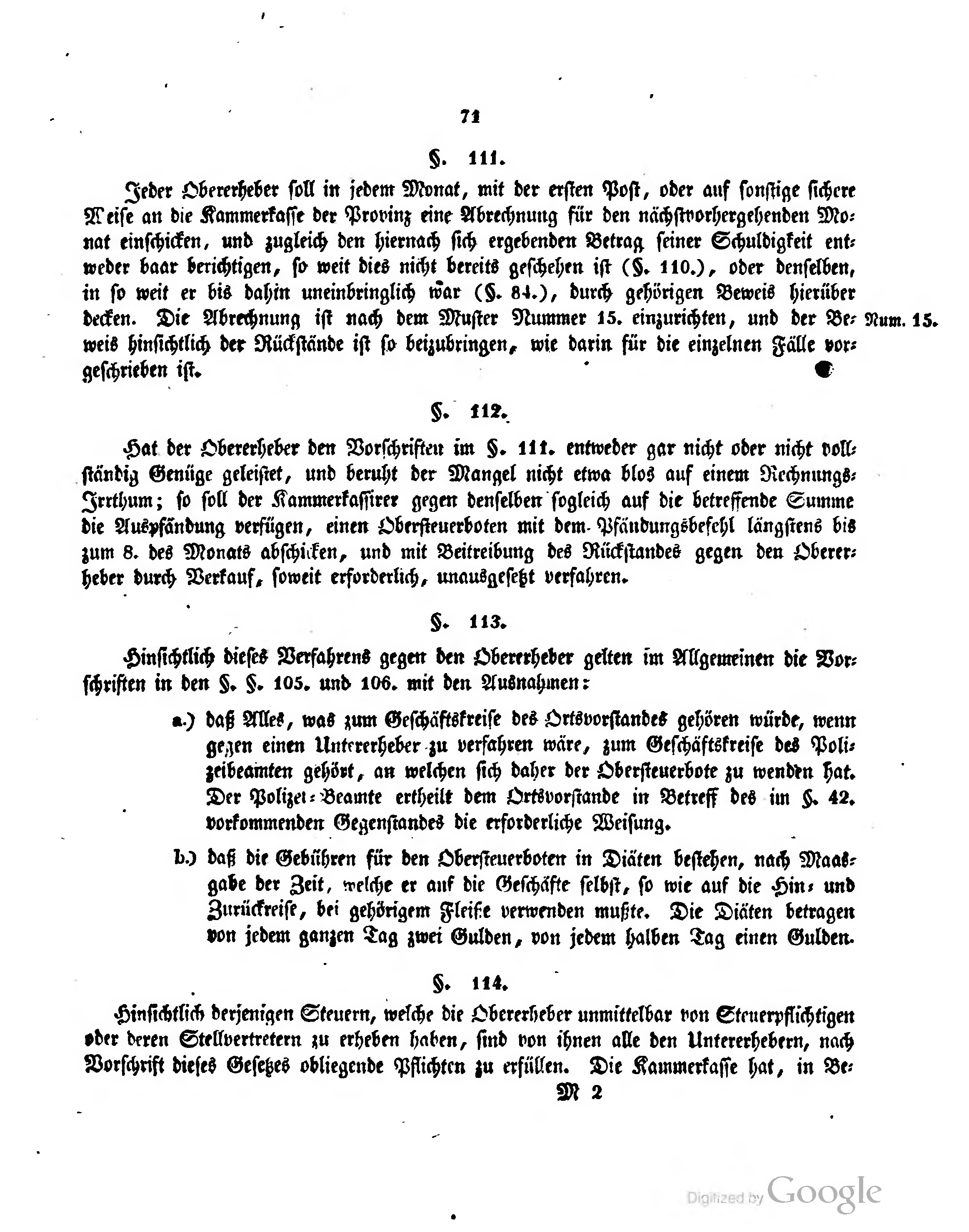 | b.) | daß die Gebühren für den Obersteuerboten in Diäten bestehen, nach Maasgabe der Zeit, welche er auf die Geschäfte selbst, so wie auf die Hin- und Zurückreise, bei gehörigem Fleiße verwenden mußte. Die Diäten betragen von jedem ganzen Tag zwei Gulden, von jedem halben Tag einen Gulden. | ||