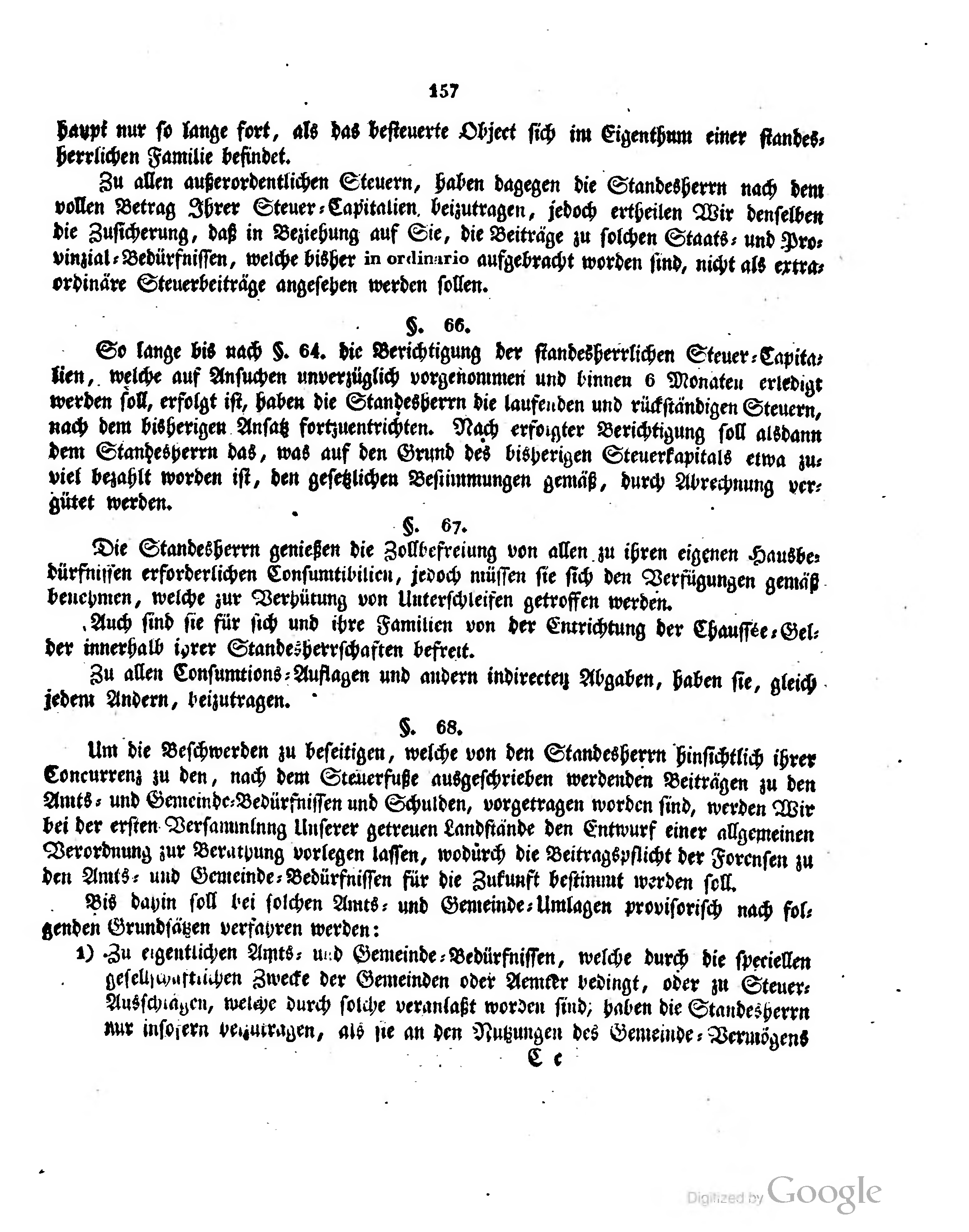 Um die Beschwerden zu beseitigen, welche von den Standesherrn hinsichtlich ihrer Concurrenz zu den, nach dem Steuerfuße ausgeschrieben werdenden Beiträgen zu den Amts- und Gemeinde-Bedürfnissen und Schulden, vorgetragen worden sind, werden Wir bei der ersten Versammlung Unserer getreuen Landstände den Entwurf einer allgemeinen Verordnung zur Berathung vorlegen lassen, wodurch die Beitragspflicht der Forensen zu den Amts- und Gemeinde Bedürfnissen für die Zukunft bestimmt werden soll.