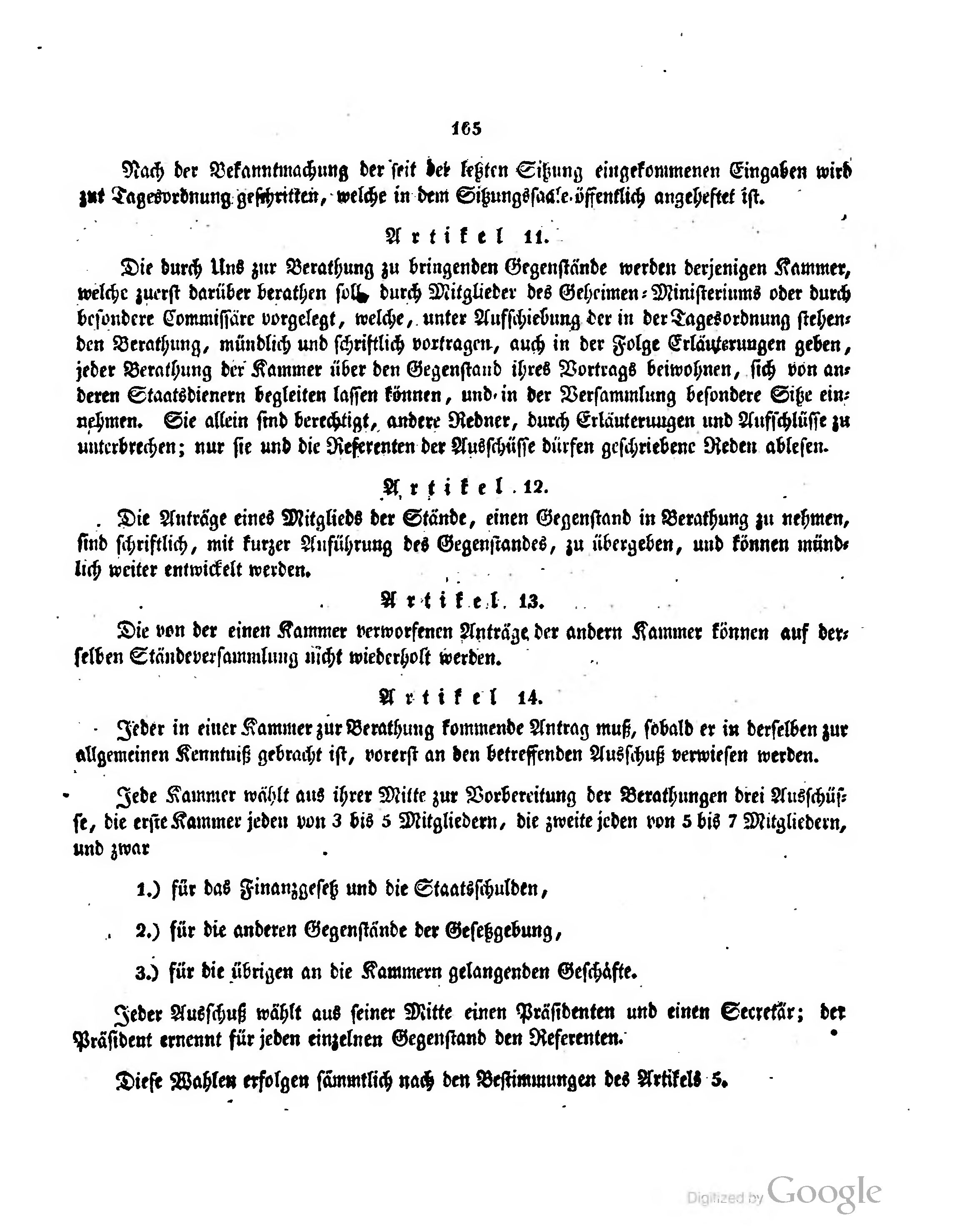 Jede Kammer wählt aus ihrer Mitte zur Vorbereitung der Berathungen drei Ausschüsse, die erste Kammer jeden von 3 bis 5 Mitgliedern, die zweite jeden von 5 bis 7 Mitgliedern, und zwar