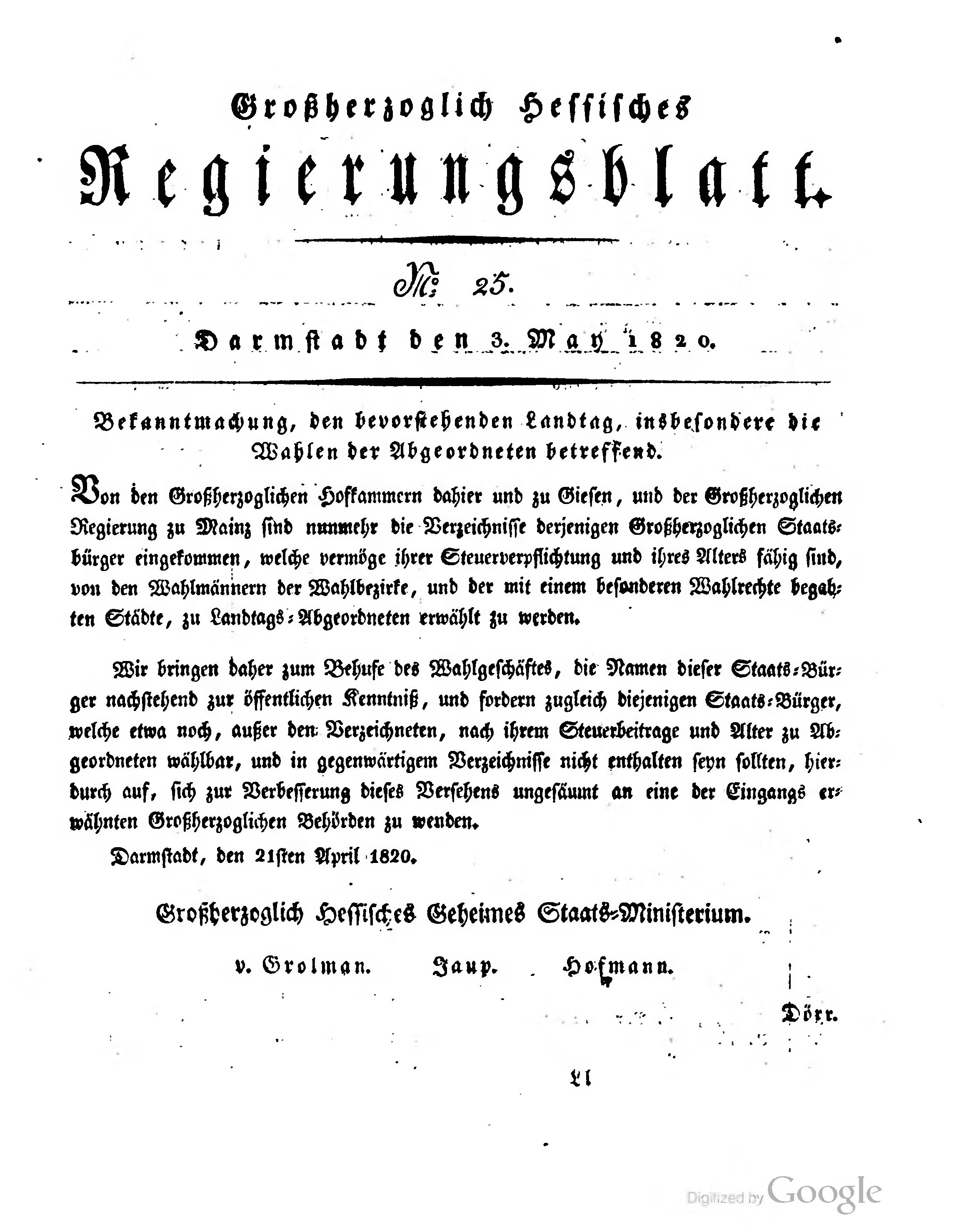 Von den Großherzoglichen Hofkammern dahier und zu Giesen, und der Großherzoglichen Regierung zu Mainz sind nunmehr die Verzeichnisse derjenigen Großherzoglichen Staatsbürger eingekommen, welche vermöge ihrer Steuerverpflichtung und ihres Alters fähig sind, von den Wahlmännern der Wahlbezirke, und der mit einem besonderen Wahlrechte begabten Städte, zu Landtags- Abgeordneten erwählt zu werden.