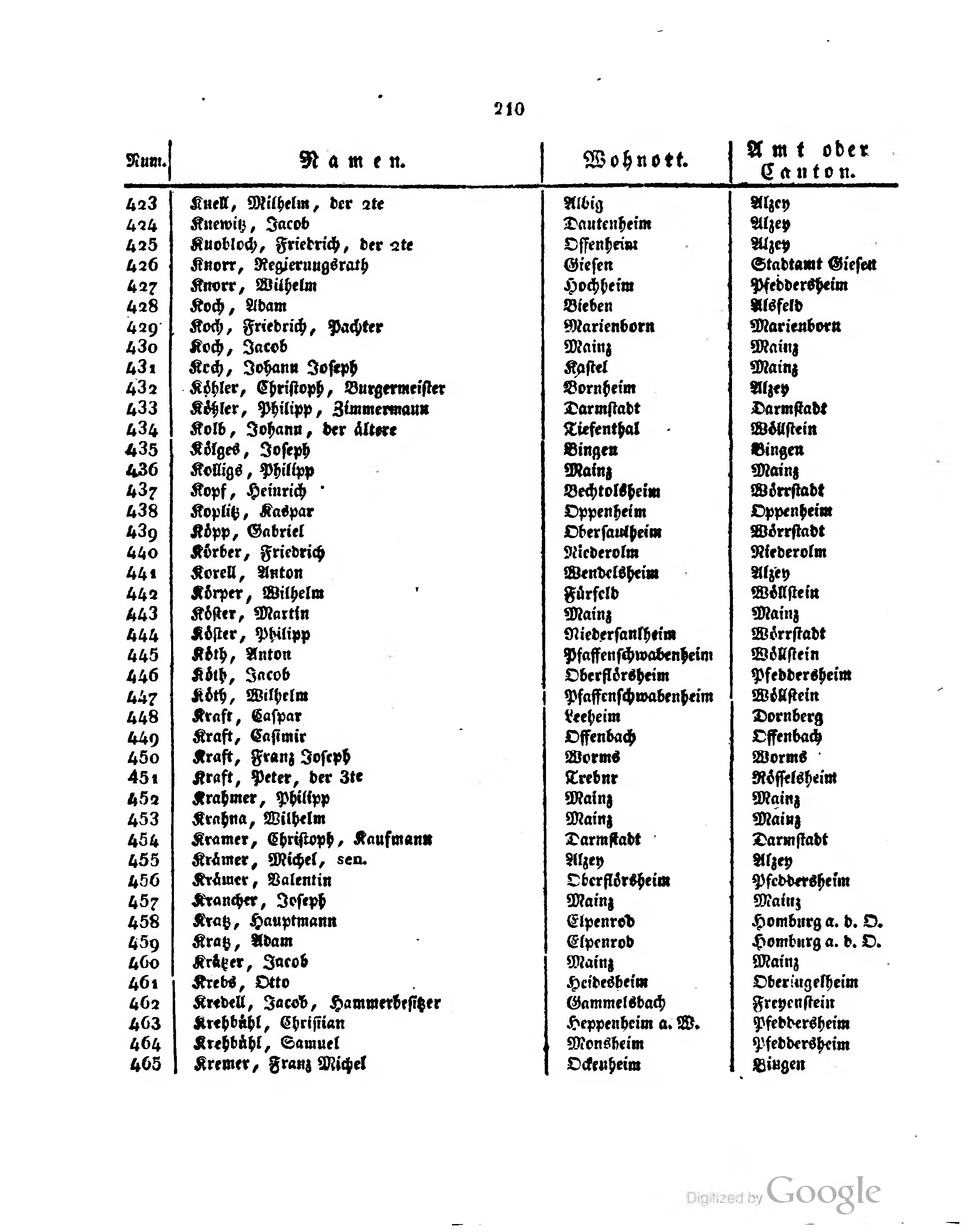 Knell, Wilhelm[GWR 1], der 2te Knewitz , Jacob Knobloch, Friedrich, der 2te Knorr, Regierungsrath Knorr, Wilhelm Koch, Adam Koch, Friedrich, Pachter Koch, Jacob Koch, Johann Joseph Köhler, Christoph, Burgermeister Köhler, Philipp, Zimmermann Kolb, Johann, der ältere Kölges, Joseph Kolligs, Philipp Kopf, Heinrich Koplitz, Kaspar Köpp, Gabriel Körber, Friedrich Korell, Anton Körper, Wilhelm Köster, Martin Köster, Philipp Köth, Anton Köth, Jacob Köth, Wilhelm Kraft, Caspar Kraft, Casimir Kraft Franz Joseph Kraft, Peter, der 3te Krahmer, Philipp Krahna, Wilhelm Kramer, Christoph, Kaufmann Krämer, Michel, Sen. Krämer, Valentin Krancher, Joseph Kratz, Hauptmann Kratz, Adam Krätzer, Jacob Krebs, Otto Kredell, Jacob, Hammerbesitzer Krehbühl, Christian Krehbühl, Samuel Kremer, Franz Michel |
