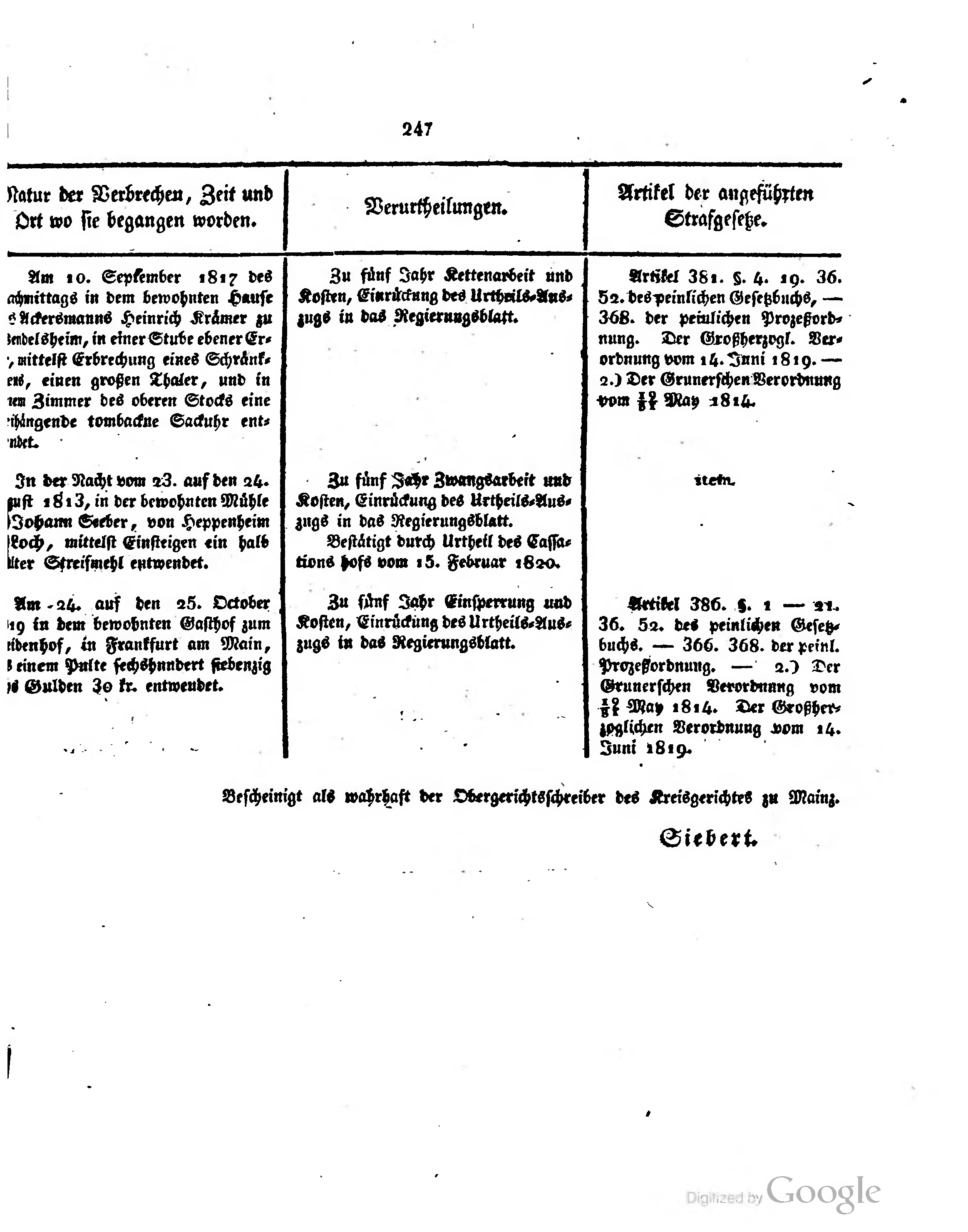 | Carl Geyer, 20 Jahr, gebürtig von Niederwiesen, ohne Stand und festen Wohnort. | 5 Schuh, 5 Zoll groß, schwarzbraune Haare und Augenbraunen, bedeckte Stirne, braune Augen, stumpfe Nase, ordinairer Mund, rundes Kinn, ovales Gesicht, gesunde Gesichtsfarbe und schmale Gestalt. | Am 10. September 1817 des Nachmittags in dem bewohnten Hause des Ackermanns Heinrich Krämer zu Wendelsheim, in einer Stube ebener Erde, mittelst Erbrechung eines Schränkchens, einen großen Thaler, und in einem Zimmer des oberen Stocks eine freihängende tombackne Sackuhr entwendet. | Zu fünf Jahren Kettenarbeit und Kosten, Einrückung des Urtheils-Auszugs in das Regierungsblatt. | Artikel 381. §. 4. 19. 36. 52. des peinlichen Gesetzbuchs, - 358. der peinlichen Prozeßordnung. Der Großherzogl. Verordnung vom 14. Juni 1819. - 2.) Der Grunerschen Verordnung vom 19/31 May 1814. | |