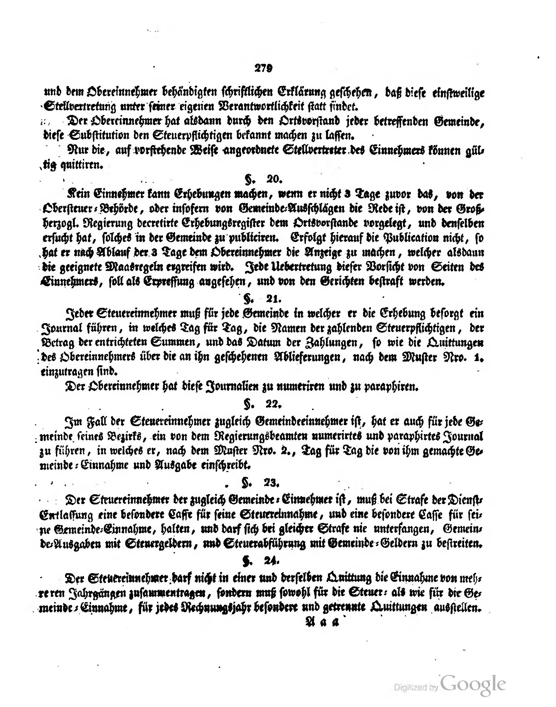Der Steuereinnehmer der zugleich Gemeinde-Einnehmer ist, muß bei Strafe der Dienst-Entlassung eine besondere Casse für seine Steuereinnahme, und eine besondere Casse für seine Gemeinde-Einnahme, halten, und darf sich bei gleicher Strafe nie unterfangen, Gemeinde-Ausgaben mit Steuergeldern, und Steuerabführung mit Gemeinde-Geldern zu bestreiten.