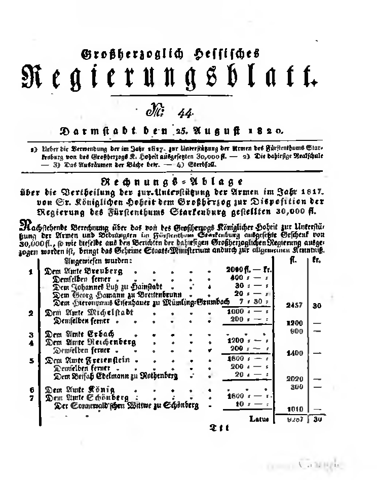 Nachstehende Berechnung über das von des Großherzogs Königlicher Hoheit zur Unterstützung der Armen und Bedrängten im Fürstenthum Starkenburg ausgesetzte Geschenk von 30,000 fl., so wie dieselbe aus den Berichten der dahiesigen Großherzoglichen Regierung ausgezogen worden ist, bringt das Geheime Staats-Ministerium andurch zur allgemeinen Kenntniß.