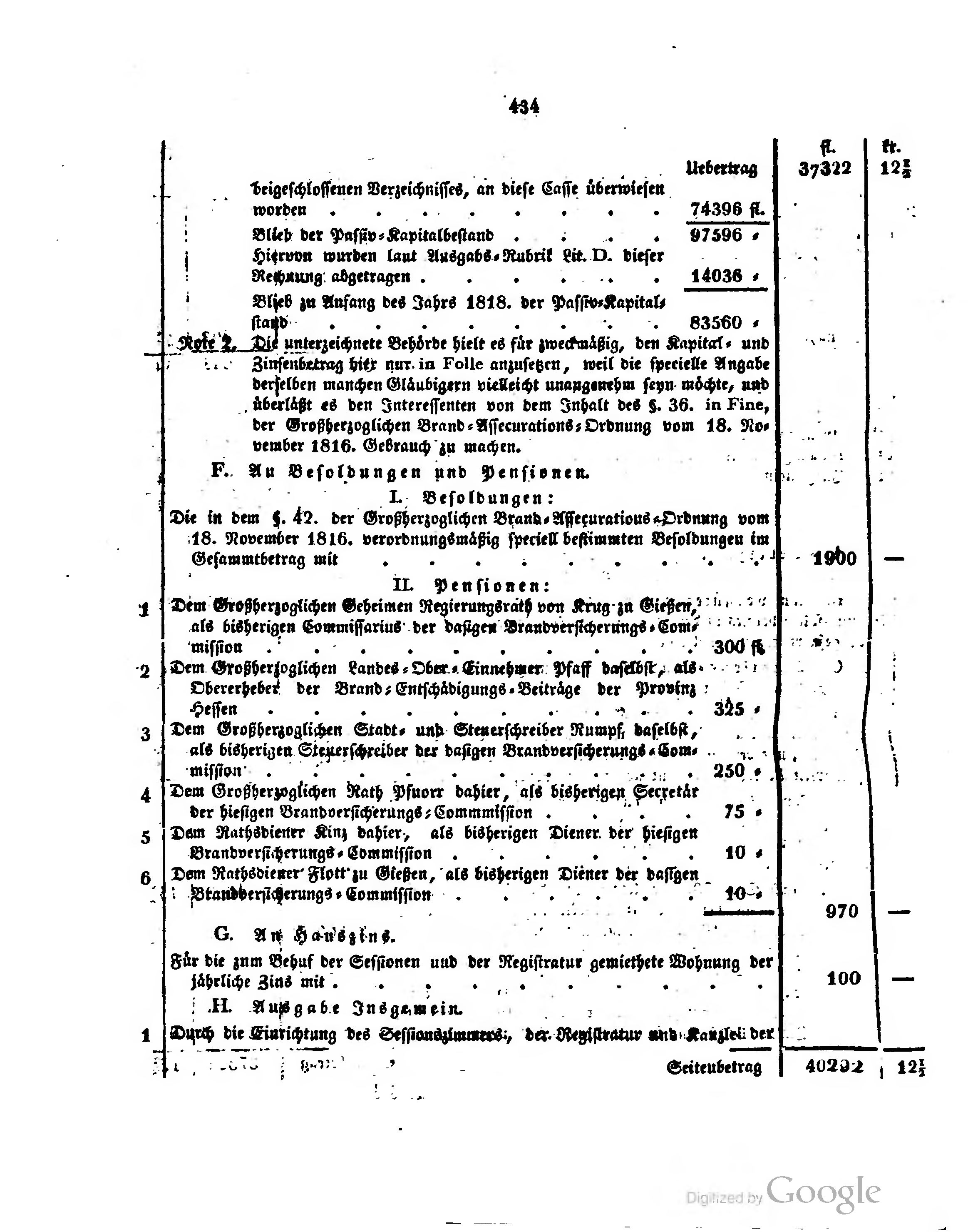 | Die in dem §. 42. der Großherzoglichen Brand-Assecurations-Ordnung vom 18. November 1816. verordnungsmäßig speciell bestimmten Besoldungen im Gesammtbetrag mit | 1900 | - | |||||