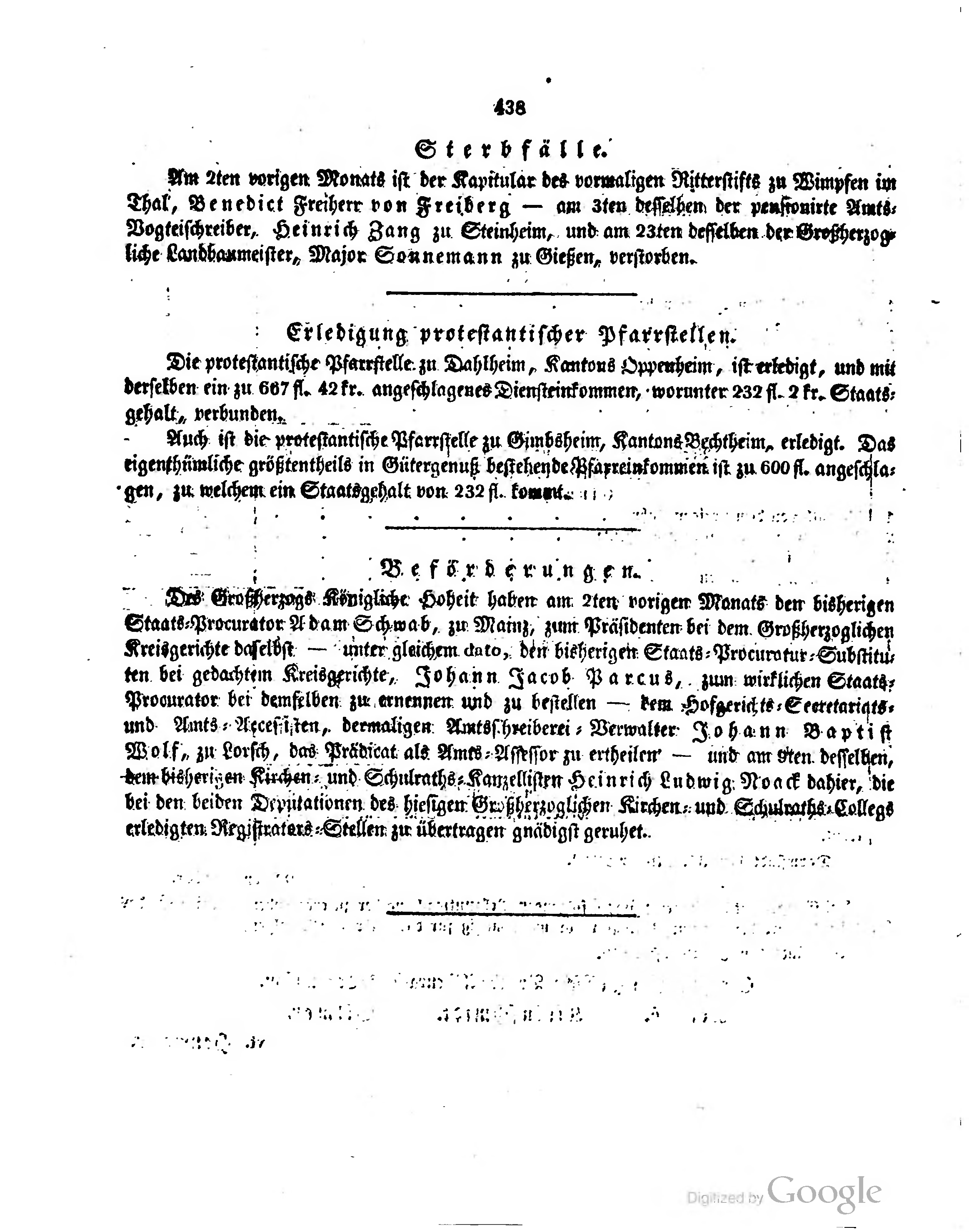 Die protestantische Pfarrstelle zu Dahlheim, Kantons Oppenheim, ist erledigt, und mit derselben ein zu 667 fl. 42 kr. angeschlagenes Diensteinkommen, worunter 232 fl. 2 kr. Staatgehalt, verbunden.