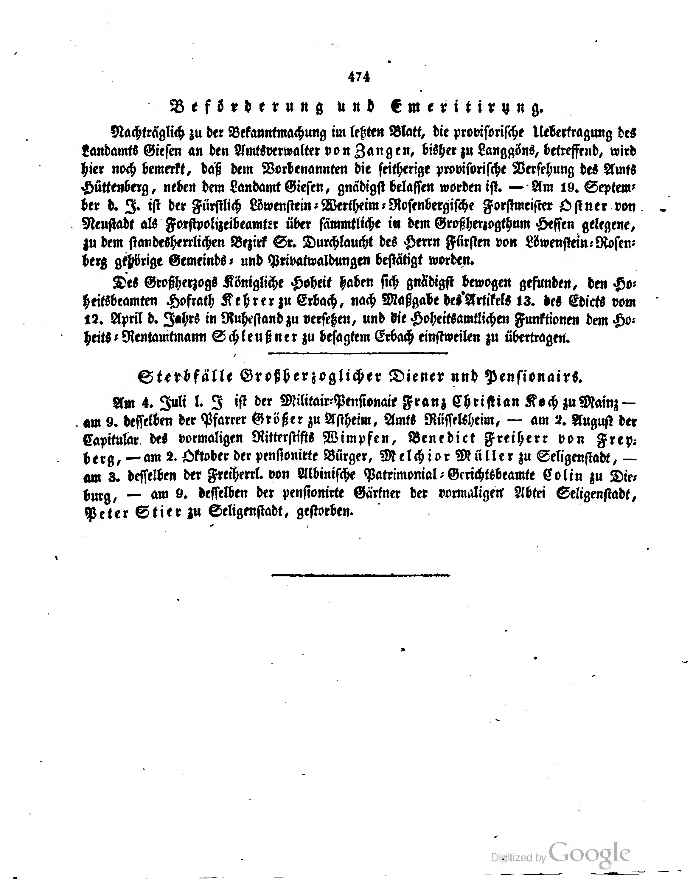 Des Großherzogs Königliche Hoheit haben sich gnädigst bewogen gefunden, den Hoheitsbeamten Hofrath Kehrer zu Erbach, nach Maßgabe des Artikels 13. des Edicts vom 12. April d. Jahrs in Ruhestand zu versehen, und die Hoheitsamtlichen Funktionen dem Hoheits-Rentamtmann Schleußner zu besagtem Erbach einstweilen zu übertragen.