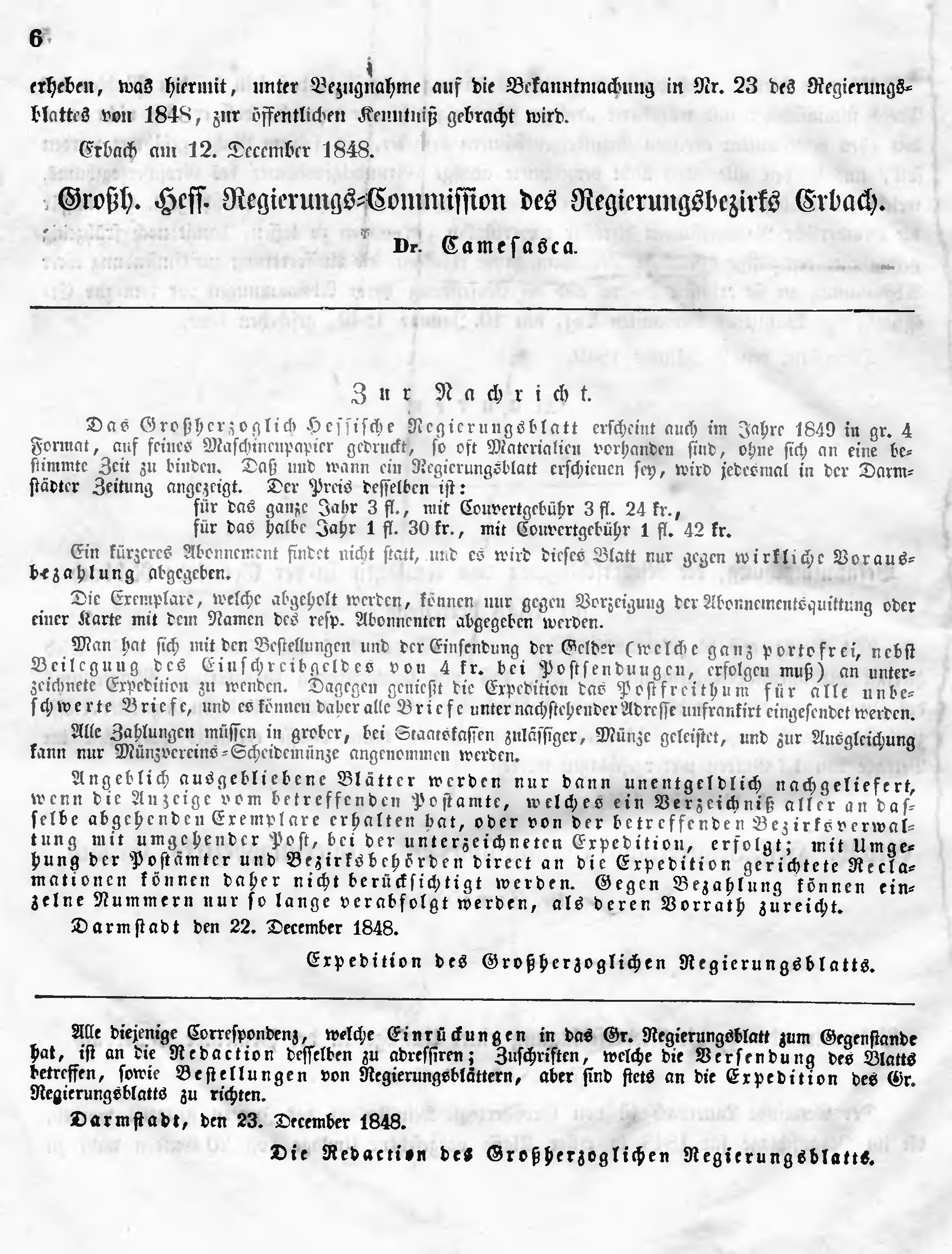 Das Großherzoglich Hessische Regierungsblatt erscheint auch im Jahre 1849 in gr. 4 Format, auf feines Maschinenpapier gedruckt, so oft Materialien vorhanden sind, ohne sich an eine bestimmte Zeit zu binden. Daß und wann ein Regierungsblatt erschienen sey, wird jedesmal in der Darmstädter Zeitung angezeigt. Der Preis desselben ist: