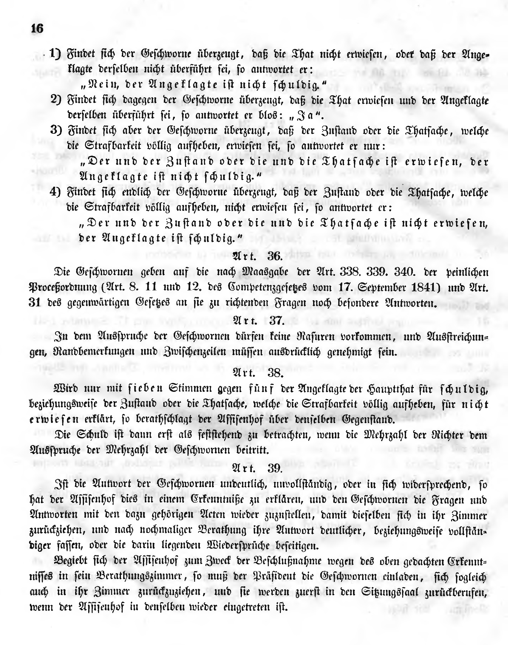 Die Geschwornen geben auf die nach Maasgabe der Art. 338. 339. 340. der peinlichen Proceßordnung (Art. 8. 11 und 12. des Competenzgesetzes vom 17. September 1841) und Art. 31 des gegenwärtigen Gesetzes an sie zu richtenden Fragen noch besondere Antworten.