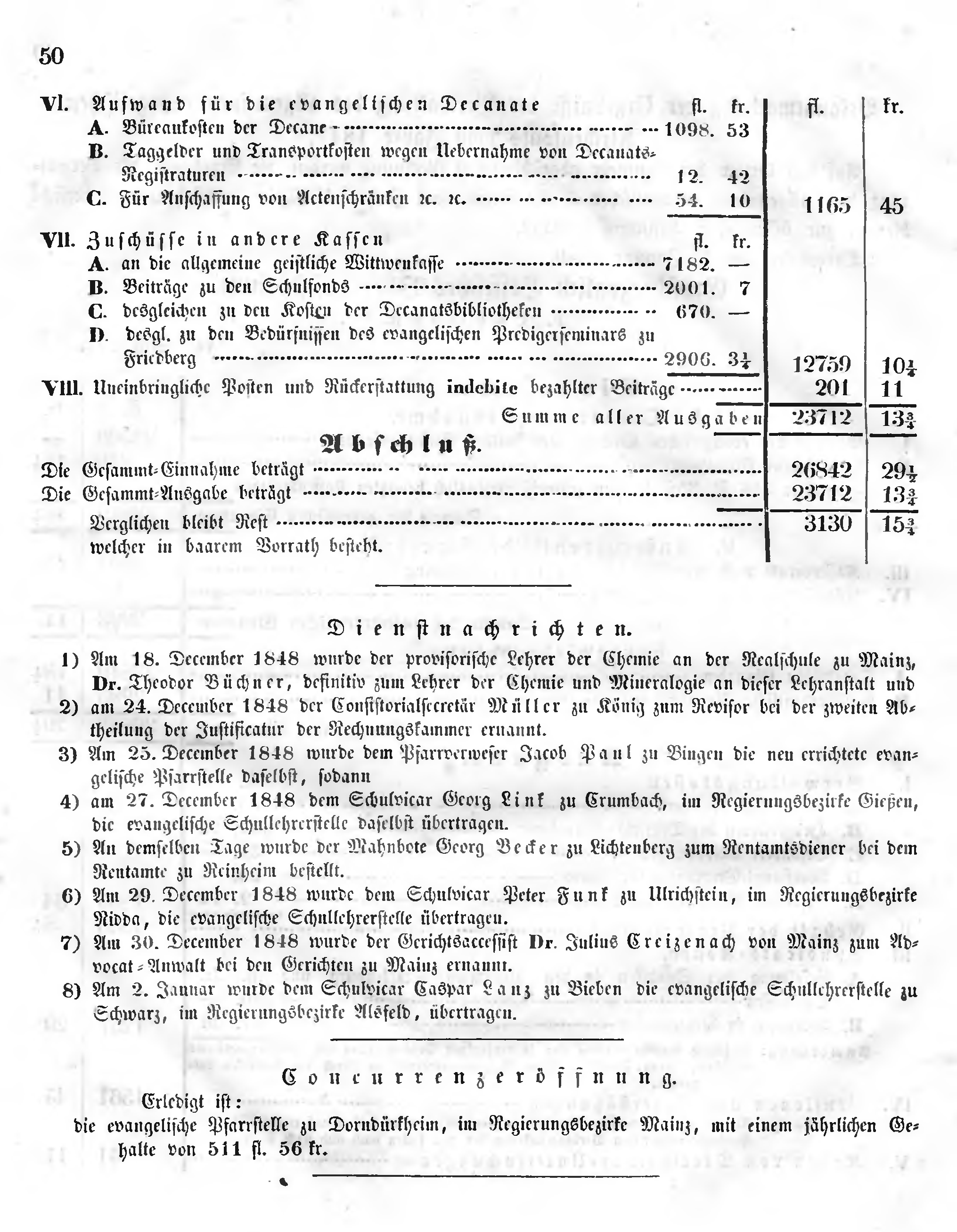 6) Am 29. December 1848 wurde dem Schulvicar Peter Funk zu Ulrichstein, im Regierungsbezirke Nidda, die evangelische Schullehrerstelle übertragen.