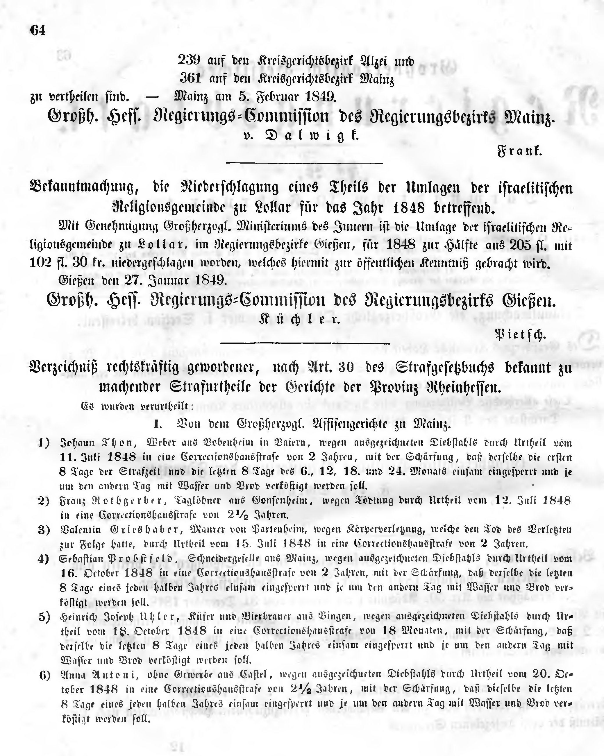5) Heinrich Joseph Uhler, Küfer und Bierbrauer aus Bingen, wegen ausgezeichneten Diebstahls durch Urtheil vom 18. October 1848 in eine Correctionshausstrafe von 18 Monaten, mit der Schärfung, daß derselbe die letzten 8 Tage eines jeden halben Jahres einsam eingesperrt und je um den andern Tag mit Wasser und Brod verköstigt werden soll.