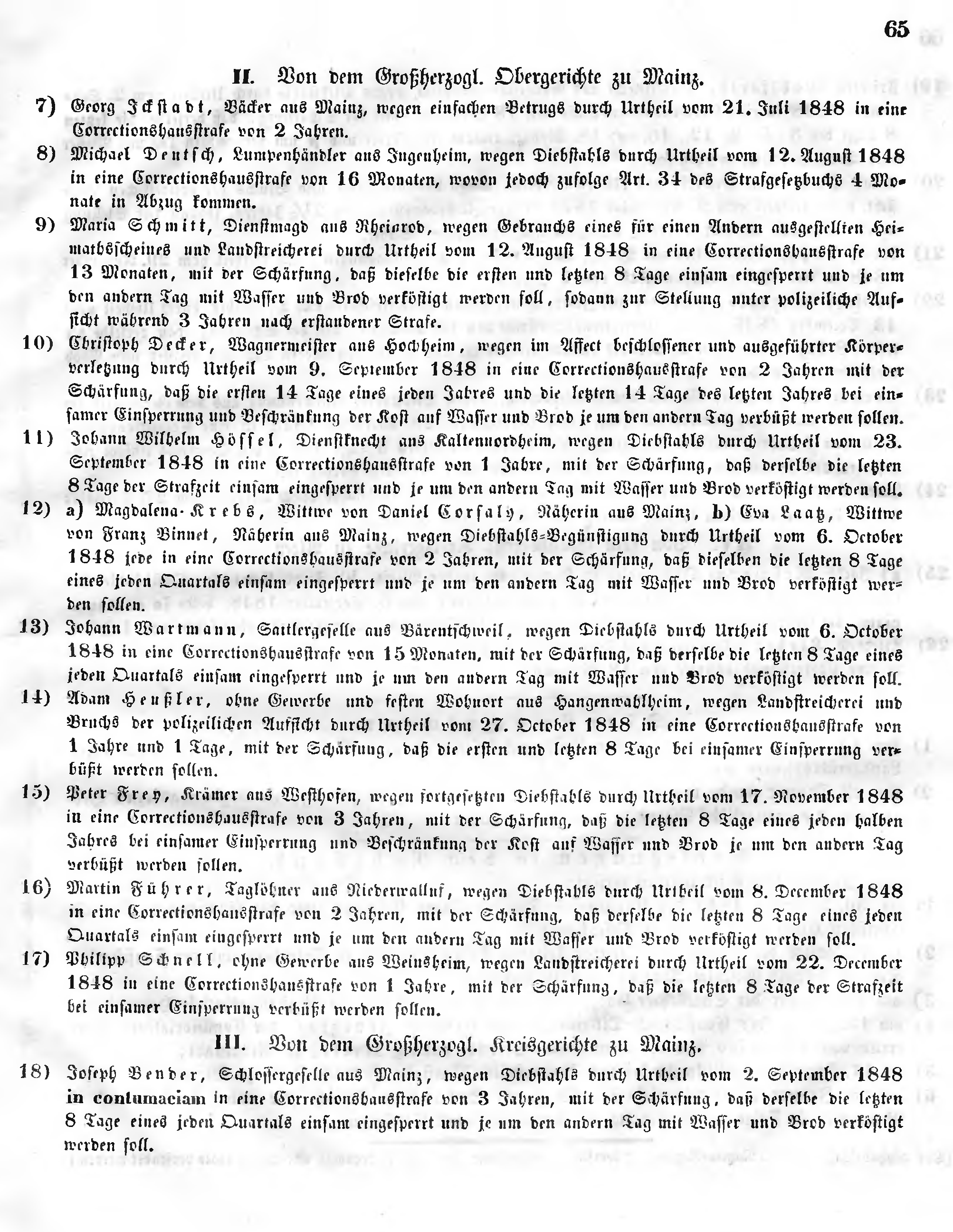 10) Christoph Decker, Wagnermeister aus Hochheim, wegen im Affect beschlossener und ausgeführter Körperverletzung durch Urtheil vom 9. September 1848 in eine Correctionshausstrafe von 2 Jahren mit der Schärfung, daß die ersten 14 Tage eines jeden Jahres und die letzten 14 Tage des letzten Jahres bei einsamer Einsperrung und Beschränkung der Kost auf Wasser und Brod je um den andern Tag verbüßt werden sollen.