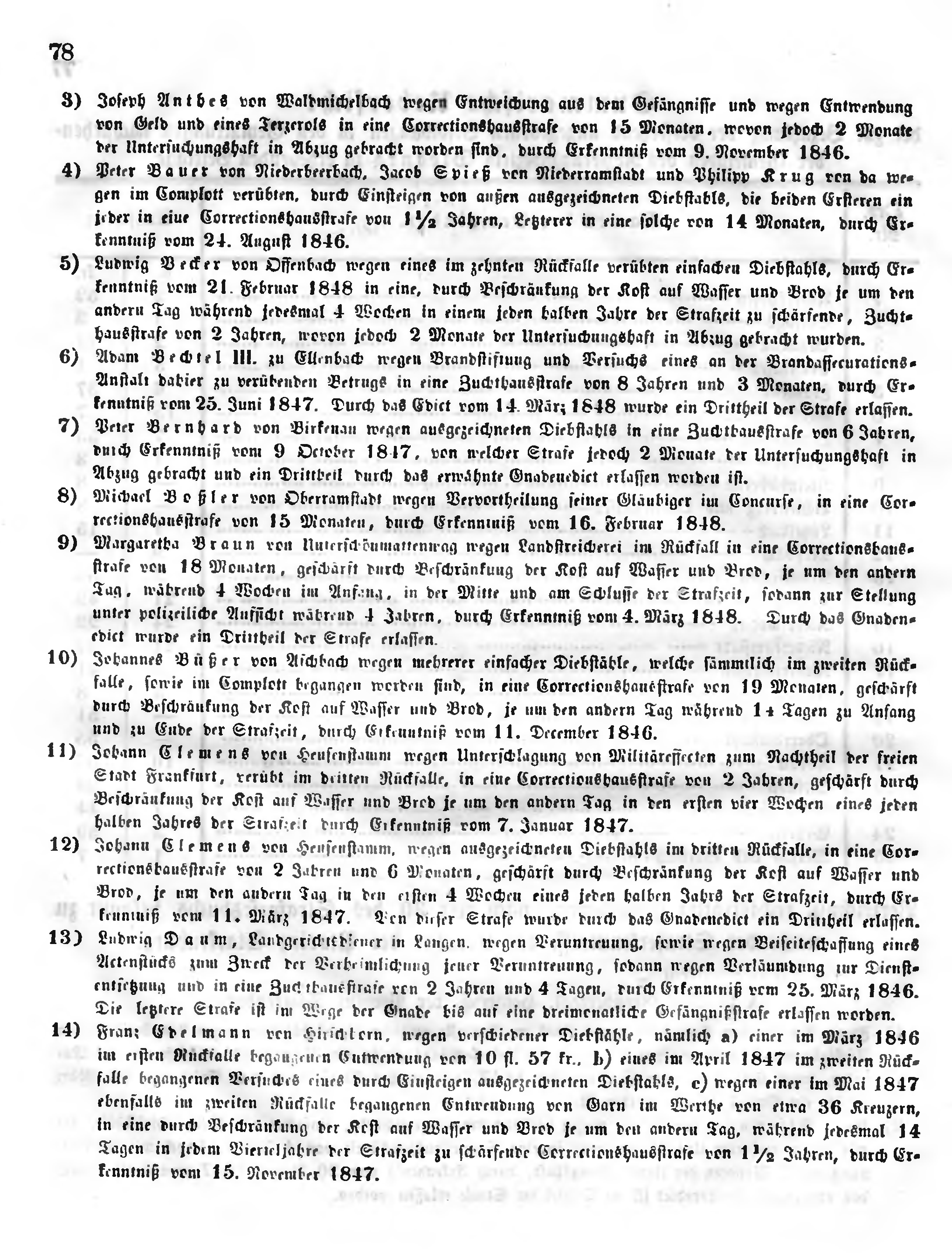 12) Johann Clemens von Heusenstamm, wegen ausgezeichneten Diebstahls im dritten Rückfalle, in eine Correctionshausstrafe von 2 Jahren und 6 Monaten, geschärft durch Beschränkung der Kost auf Wasser und Brod, je um den andern Tag in den ersten 4 Wochen eines jeden halben Jahrs der Strafzeit, durch Erkenntniß vom 11. März 1847. Von dieser Strafe wurde durch das Gnadenedict ein Drittheil erlassen.