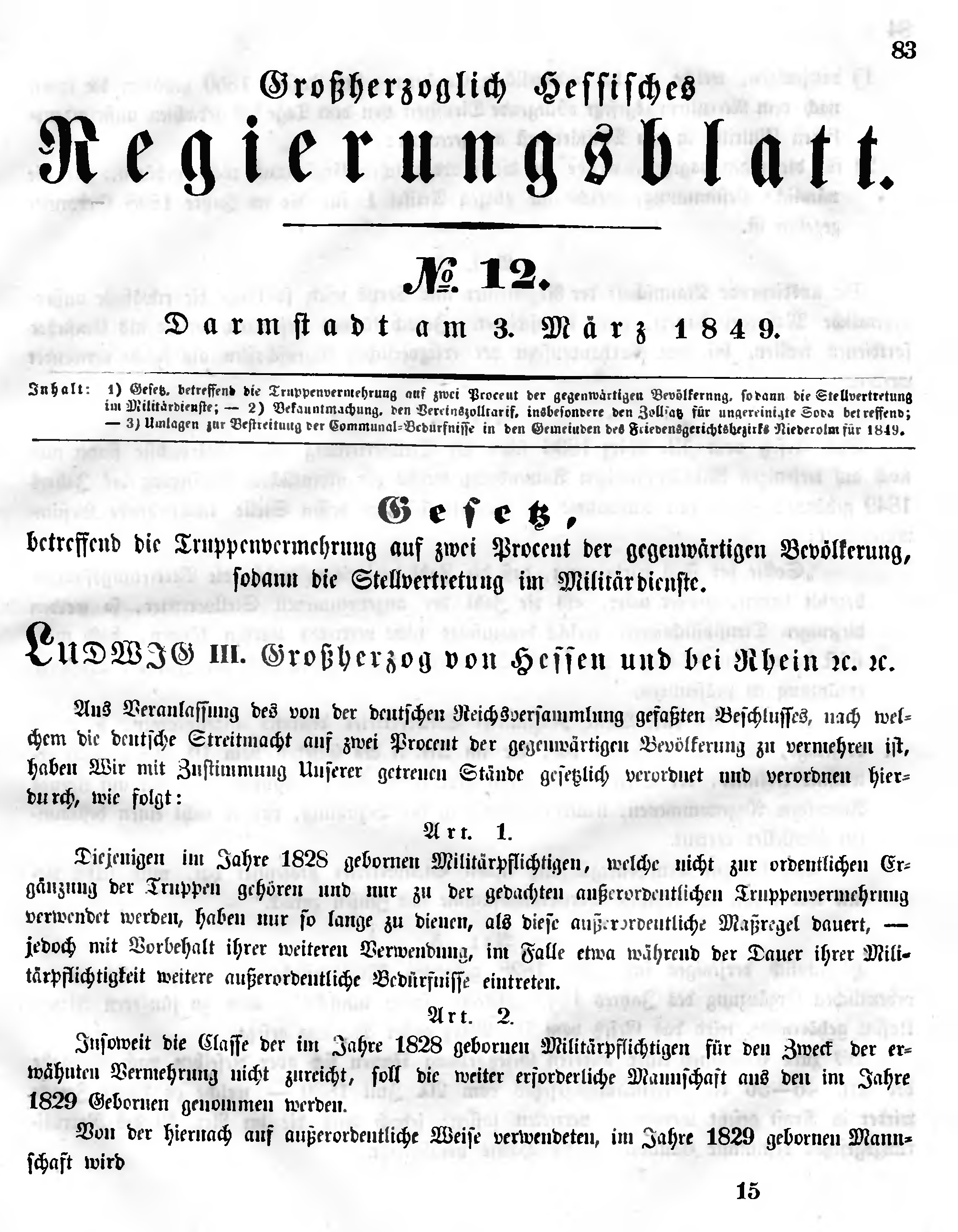 Inhalt : 1) Gesetz, betreffend die Truppenvermehrung auf zwei Procent der gegenwärtigen Bevölkerung, sodann die Stellvertretung im Militärdienste; - 2) Bekanntmachung, den Vereinszolltarif, insbesondere den Zollsatz für ungereinigte Soda beitreffend; - 3) Umlagen zur Bestreitung der Communal-Bedürfnisse in den Gemeinden des Friedensgerichtsbezirks Niederolm für 1849.