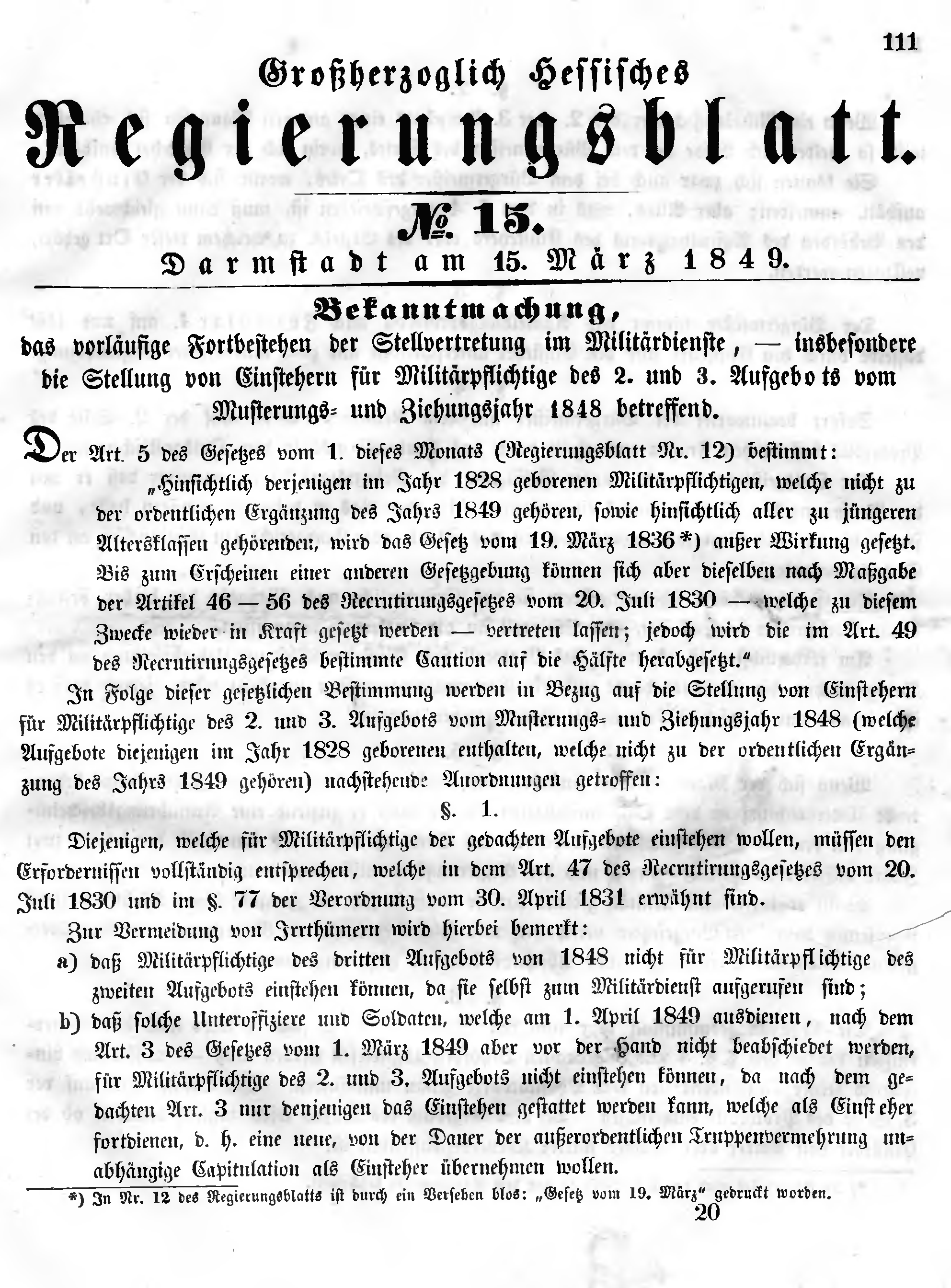 - "Hinsichtlich derjenigen im Jahr 1828 geborenen Militärpflichtigen, welche nicht zu der ordentlichen Ergänzung des Jahrs 1849 gehören, sowie hinsichtlich aller zu jüngeren Altersklassen gehörenden, wird das Gesetz vom 19. März 1836 *) außer Wirkung gesetzt. Bis zum Erscheinen einer anderen Gesetzgebung können sich aber dieselben nach Maßgabe der Artikel 46-56 des Recrutirungsgesetzes vom 20. Juli 1830 - welche zu diesem Zwecke wieder in Kraft gesetzt werden - vertreten lassen; jedoch wird die im Art. 49 des Recrutirungsgesetzes bestimmte Caution auf die Hälfte herabgesetzt.«