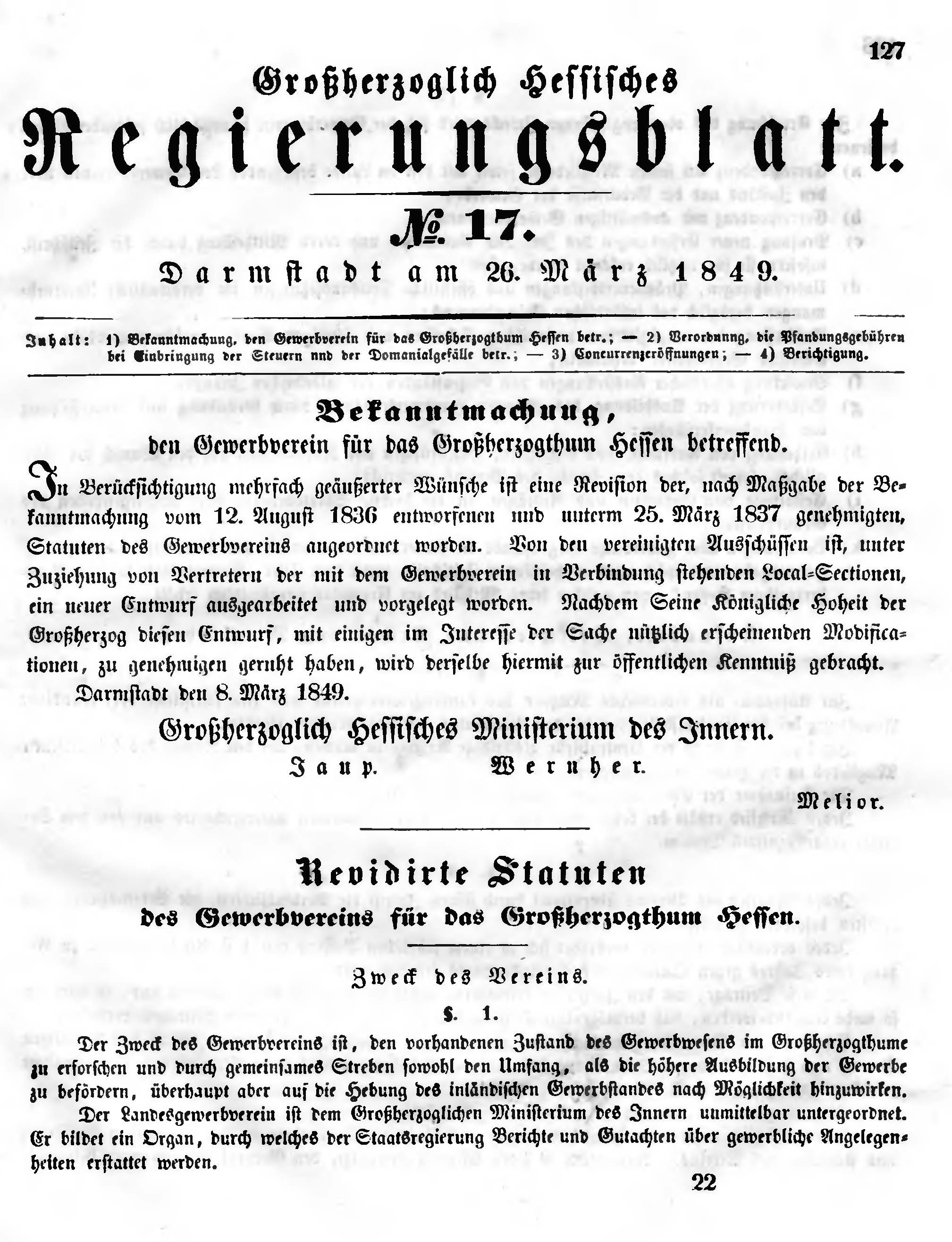 Der Zweck des Gewerbvereins ist, den vorhandenen Zustand des Gewerbwesens im Großherzogthume zu erforschen und durch gemeinsames Streben sowohl den Umfang, als die höhere Ausbildung der Gewerbe zu befördern, überhaupt aber auf die Hebung des inländischen Gewerbstandes nach Möglichkeit hinzuwirken.