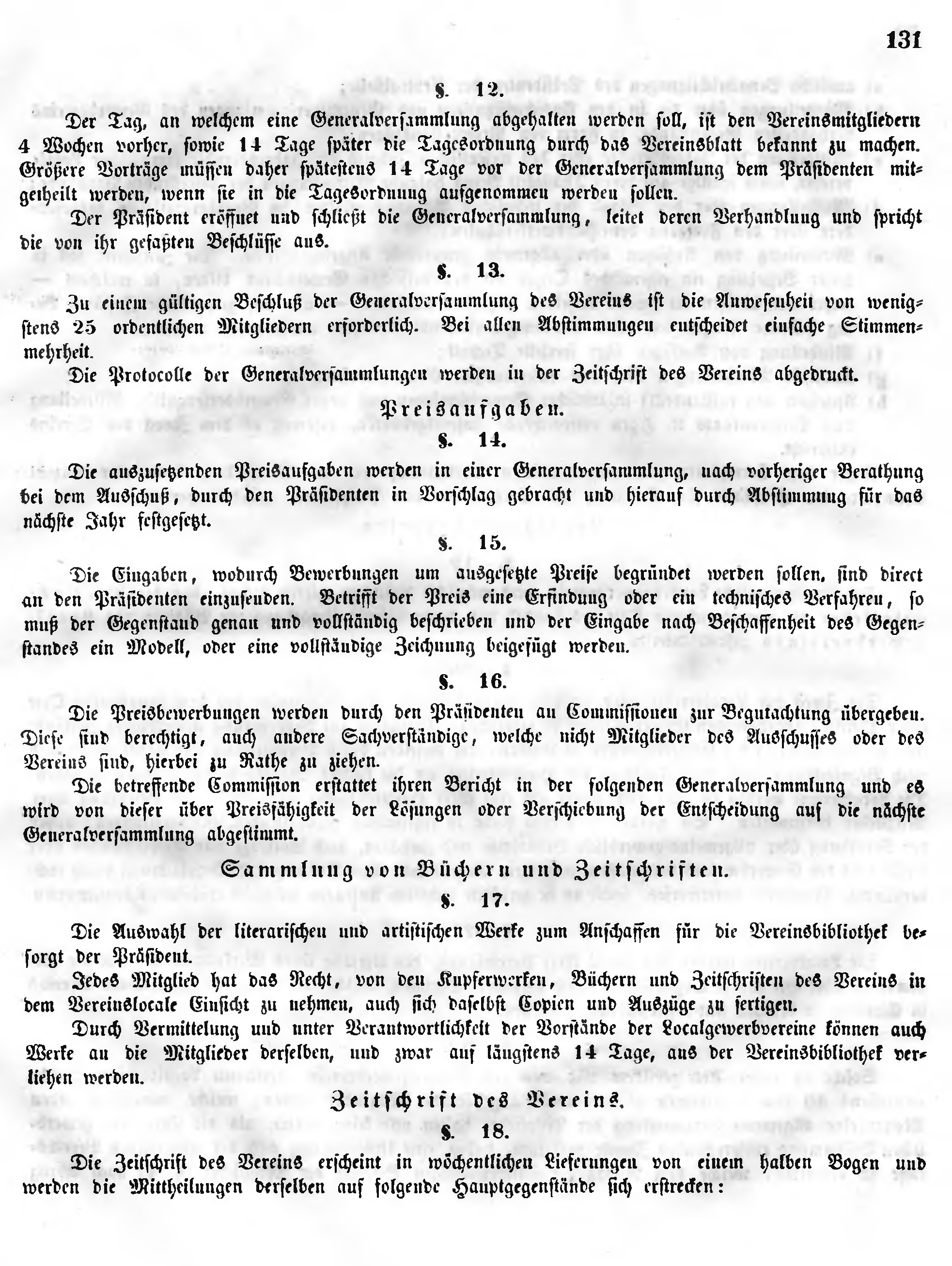Der Tag, an welchem eine Generalversammlung abgehalten werden soll, ist den Vereinsmitgliedern 4 Wochen vorher, sowie 14 Tage später die Tagesordnung durch das Vereinsblatt bekannt zu machen. Größere Vorträge müssen daher spätestens 14 Tage vor der Generalversammlung dem Präsidenten mitgetheilt werden, wenn sie in die Tagesordnung aufgenommen werden sollen.