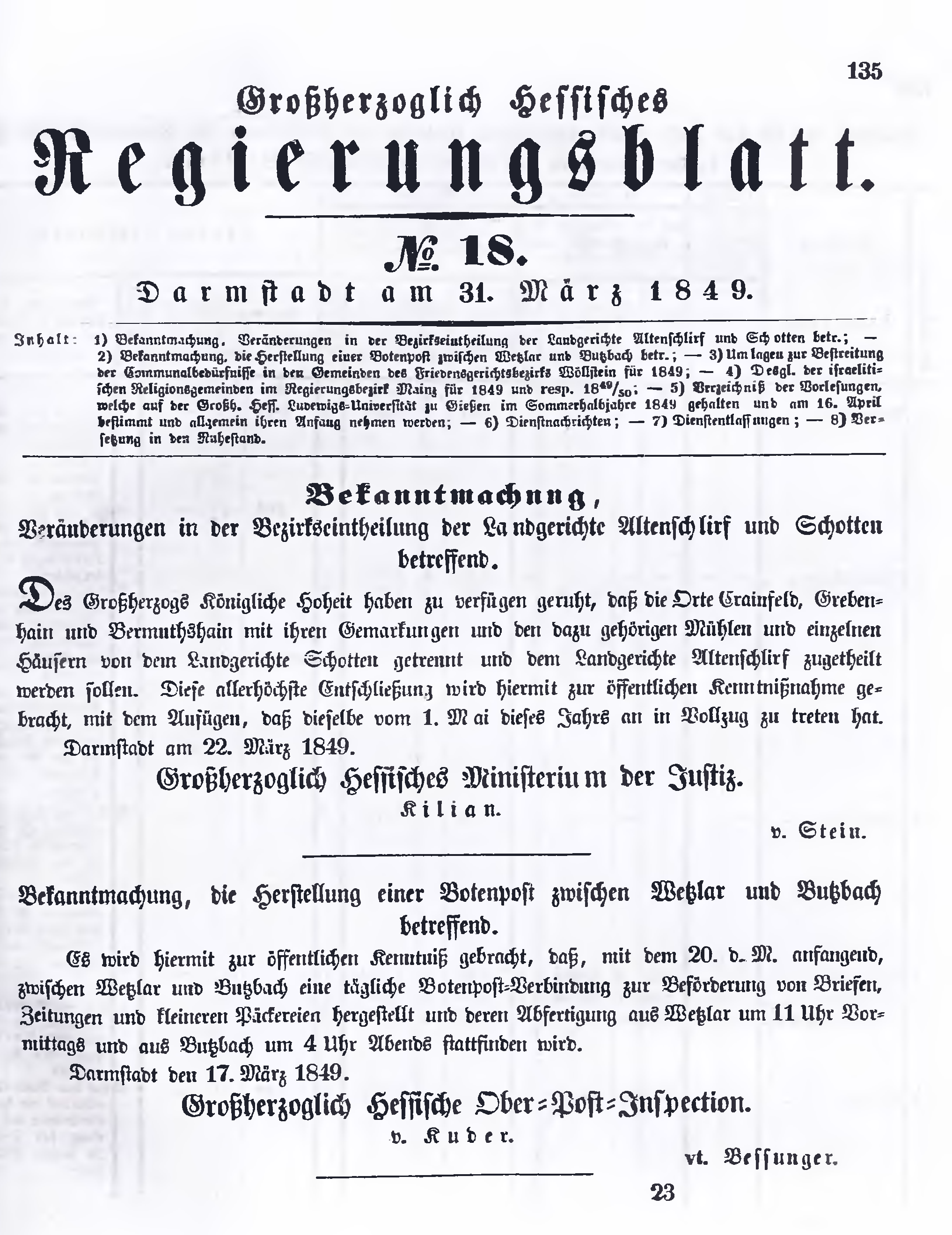 Inhalt : 1) Bekanntmachung, Veränderungen in der Bezirkseintheilung der Landgerichte Altenschlirf und Schotten betr.; - 2) Bekanntmachung, die Herstellung einer Botenpost zwischen Wetzlar und Butzbach betr.; - 3) Umlagen zur Bestreitung der Communalbedürfnisse in den Gemeinden des Friedensgerichtsbezirks Wöllstein für 1849; - 4) Desgl. der israelitischen Religionsgemeinden im Regierungsbezirk Mainz für 1949 und resp. 1849/50; - ) Verzeichniß der Vorlesungen, welche auf der Großh. Hess. Ludewigs-Universität zu Gießen im Sommerhalbjahre 1849 gehalten und am 16. April bestimmt und allgemein ihren Anfang nehmen werden; - 6) Dienstnachrichten; - 7) Dienstentlassungen; - 8) Versetzung in den Ruhestand.