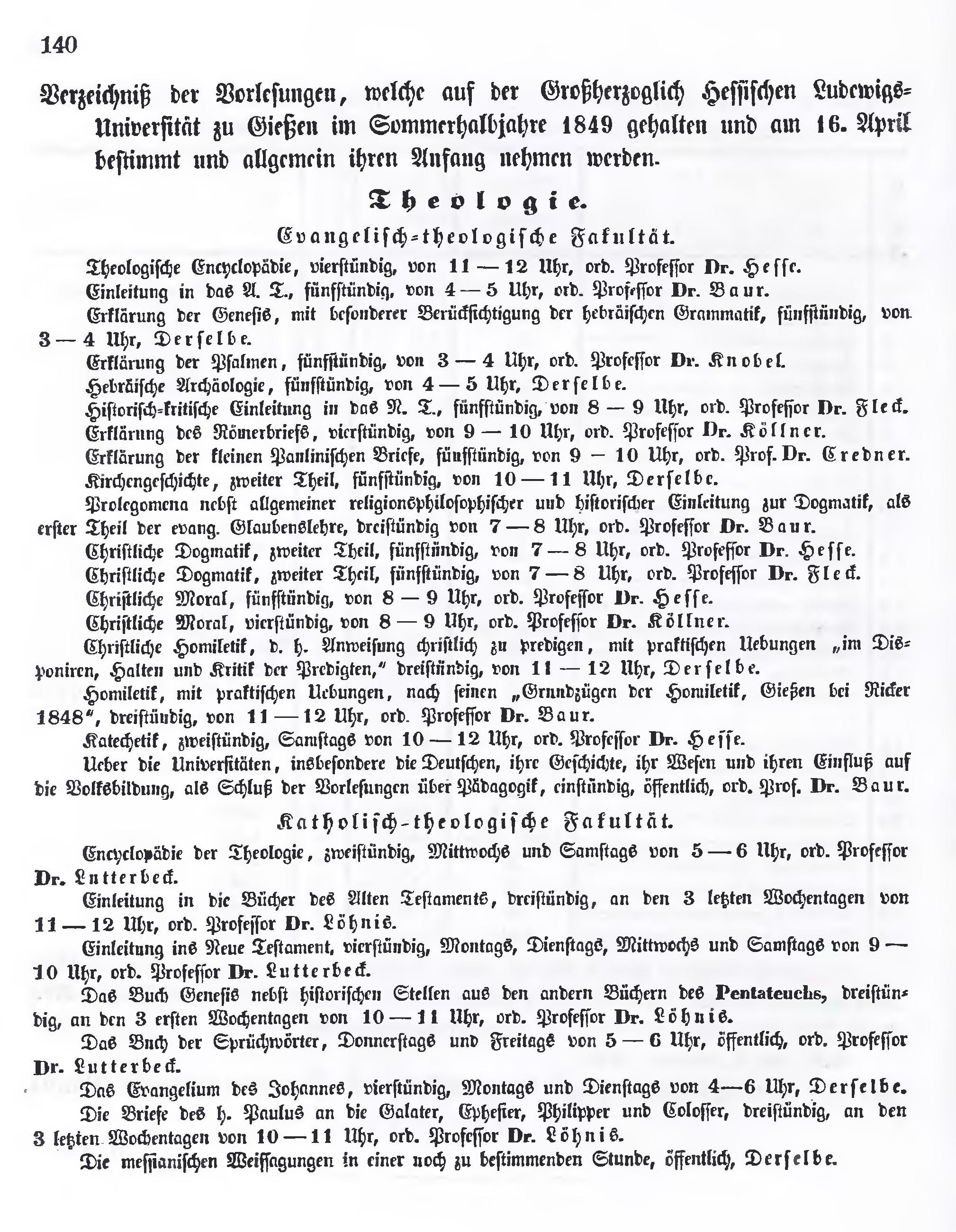 Homiletik, mit praktischen Uebungen, nach seinen "Grundzügen der Homiletik, Gießen bei Rieker 1848", dreistündig, von 11-12 Uhr, ord. Professor Dr. Baur.