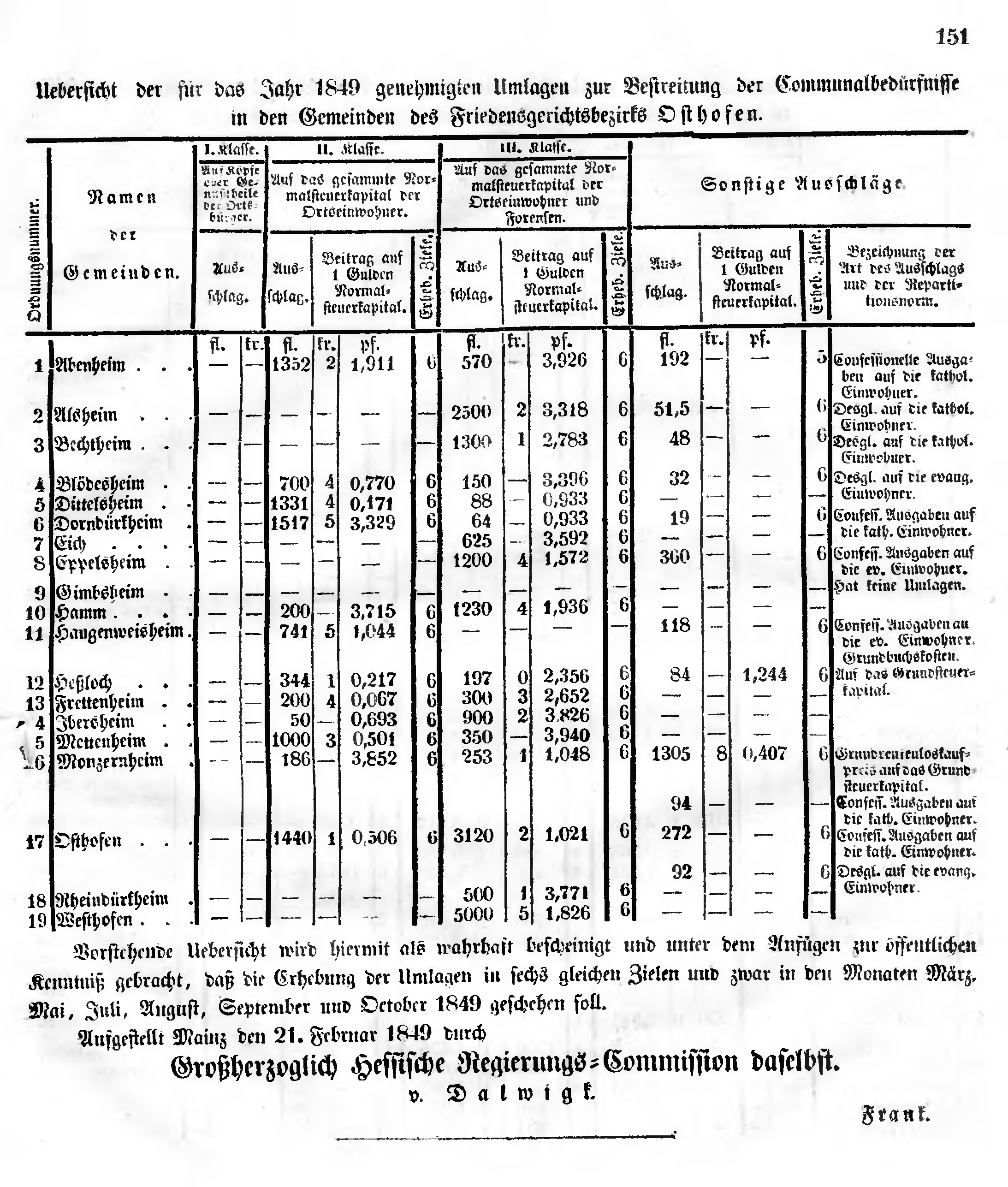 Uebersicht der für das Jahr 1849 genehmigten Umlagen zur Bestreitung der Communalbedürfnisse in den Gemeinden des Friedensgerichtbezirks Osthofen.
