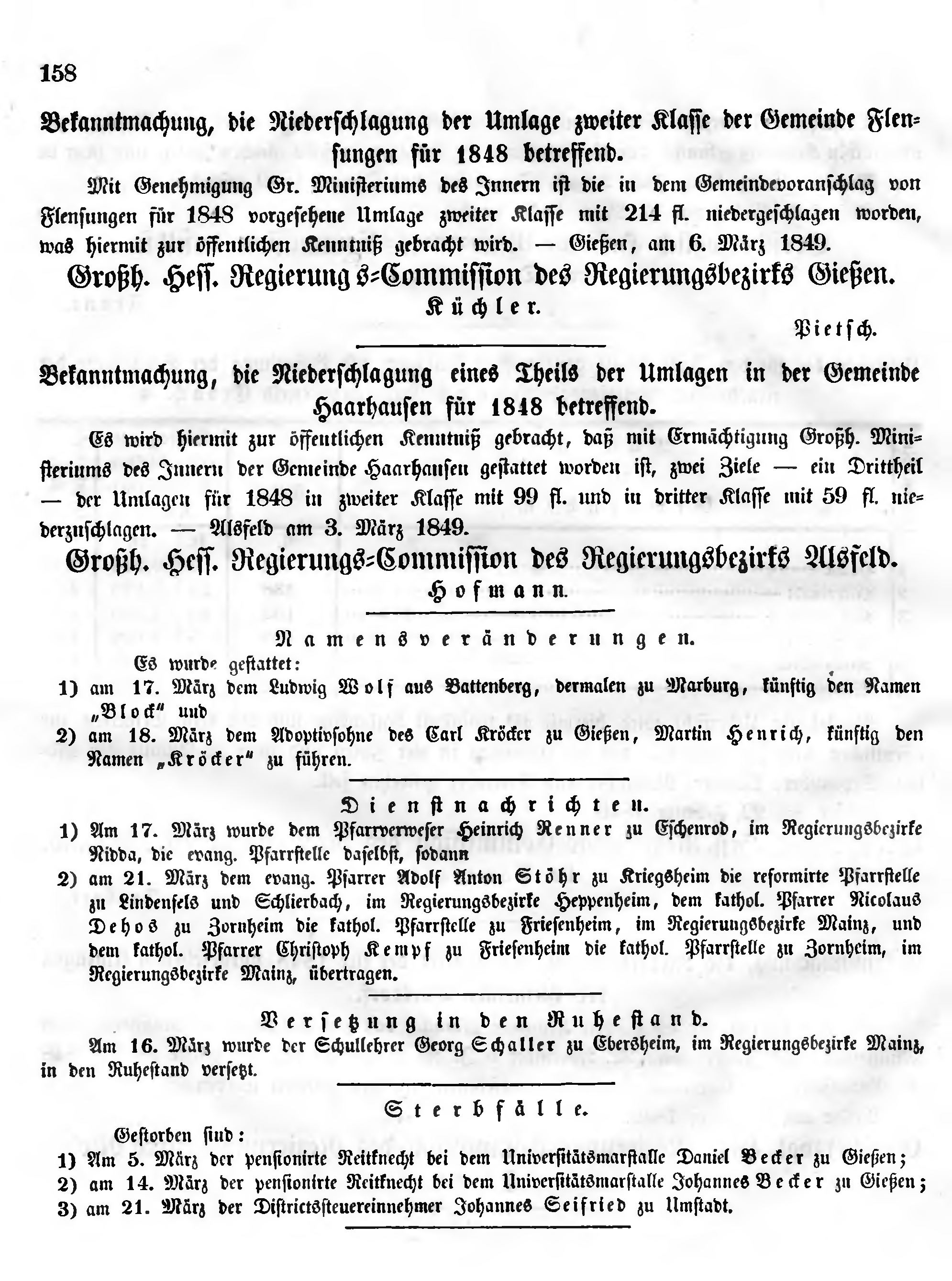 2) im 18. März dem Adoptivsohne des Carl Kröcker zu Gießen, Martin Henrich, künftig den Namen "Kröcker" zu führen.