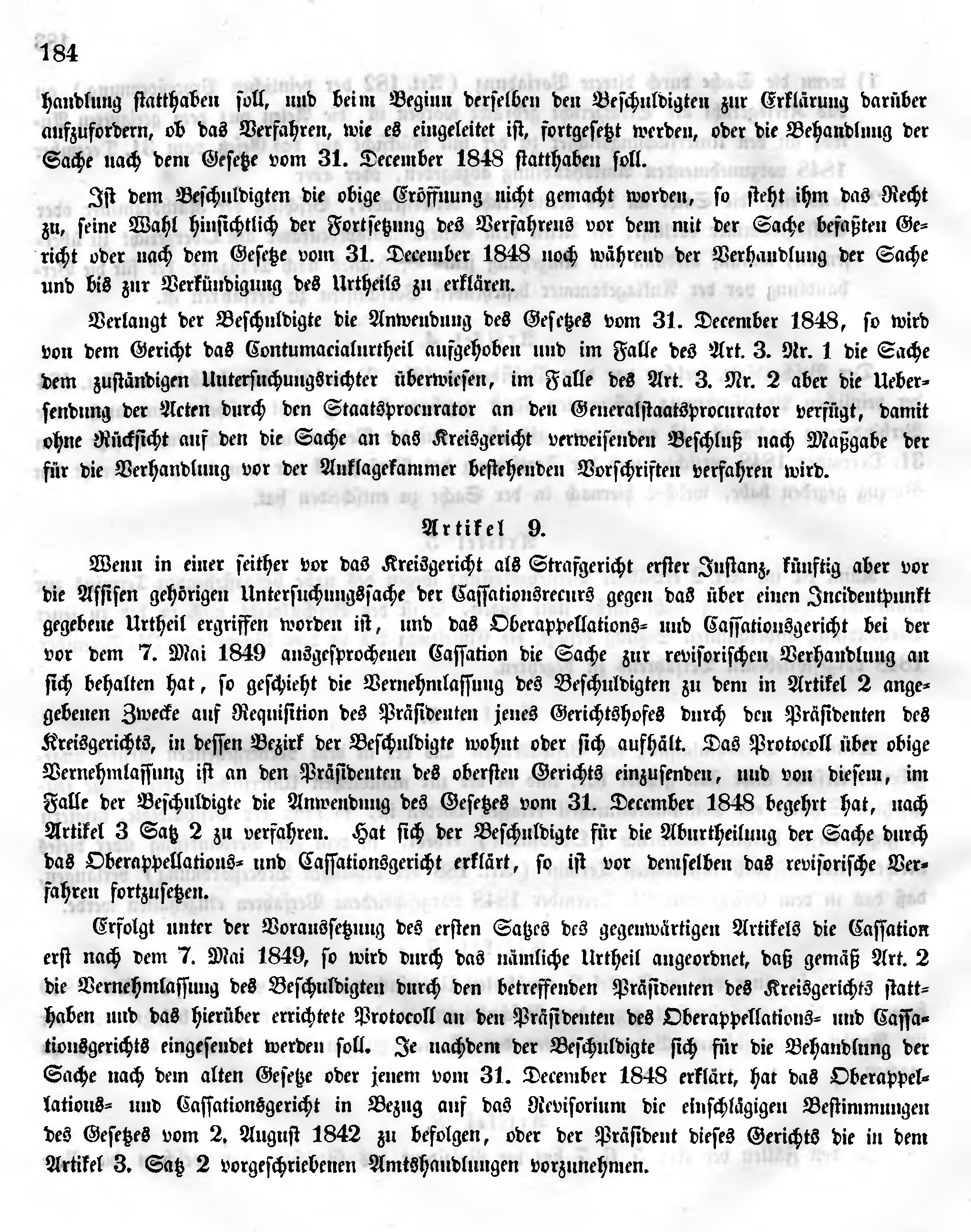 Erfolgt unter der Voraussetzung des ersten Satzes des gegenwärtigen Artikels die Cassation erst nach dem 7. Mai 1849, so wird durch das nämliche Urtheil angeordnet, daß gemäß Art. 2 die Vernehmlassung des Beschuldigten durch den betreffenden Präsidenten des Kreisgerichts statthaben und das hierüber errichtete Protocoll an den Präsidenten des Oberappellations- und Cassationsgerichts eingesendet werden soll. Je nachdem der Beschuldigte sich für die Behandlung der Sache nach dem alten Gesetze oder jenem vom 31. December 1848 erklärt, hat das Oberappellations- und Cassationsgericht in Bezug auf das Revisorium die einschlägigen Bestimmungen des Gesetzes vom 2. August 1842 zu befolgen, oder der Präsident dieses Gerichts die in dem Artikel 3. Satz 2 vorgeschriebenen Amtshandlungen vorzunehmen.