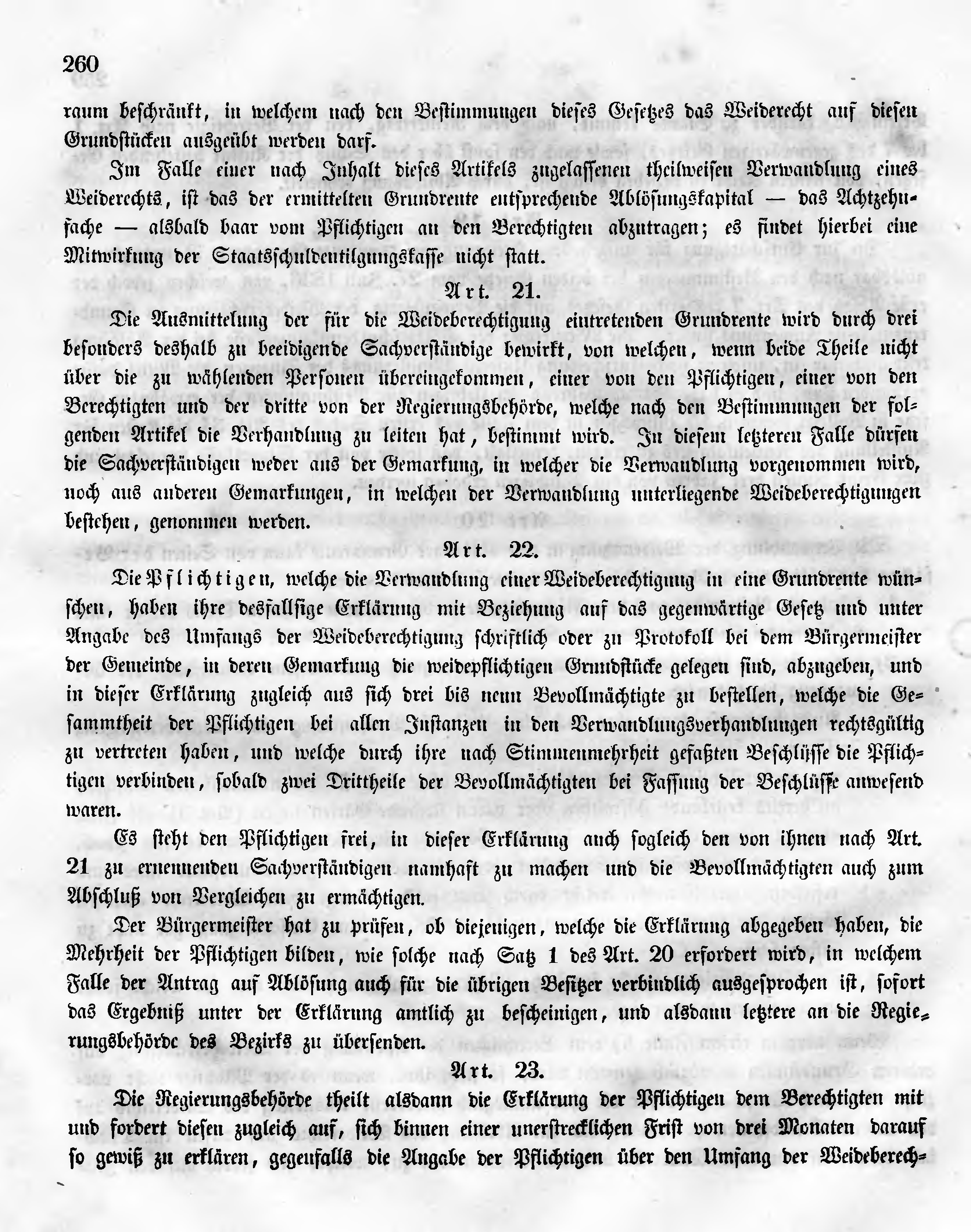 Die Ausmittelung der für die Weideberechtigung eintretenden Grundrente wird durch drei besonders deshalb zu beeidigende Sachverständige bewirkt, von welchen, wenn beide Theile nicht über die zu wählenden Personen übereingekommen, einer von den Pflichtigen, einer von den Berechtigten und der dritte von der Regierungsbehörde, welche nach den Bestimmungen der folgenden Artikel die Verhandlung zu leiten hat, bestimmt wird. In diesem letzteren Falle dürfen die Sachverständigen weder aus der Gemarkung, in welcher die Verwandlung vorgenommen wird, noch aus anderen Gemarkungen, in welchen der Verwandlung unterliegende Weideberechtigungen bestehen, genommen werden.