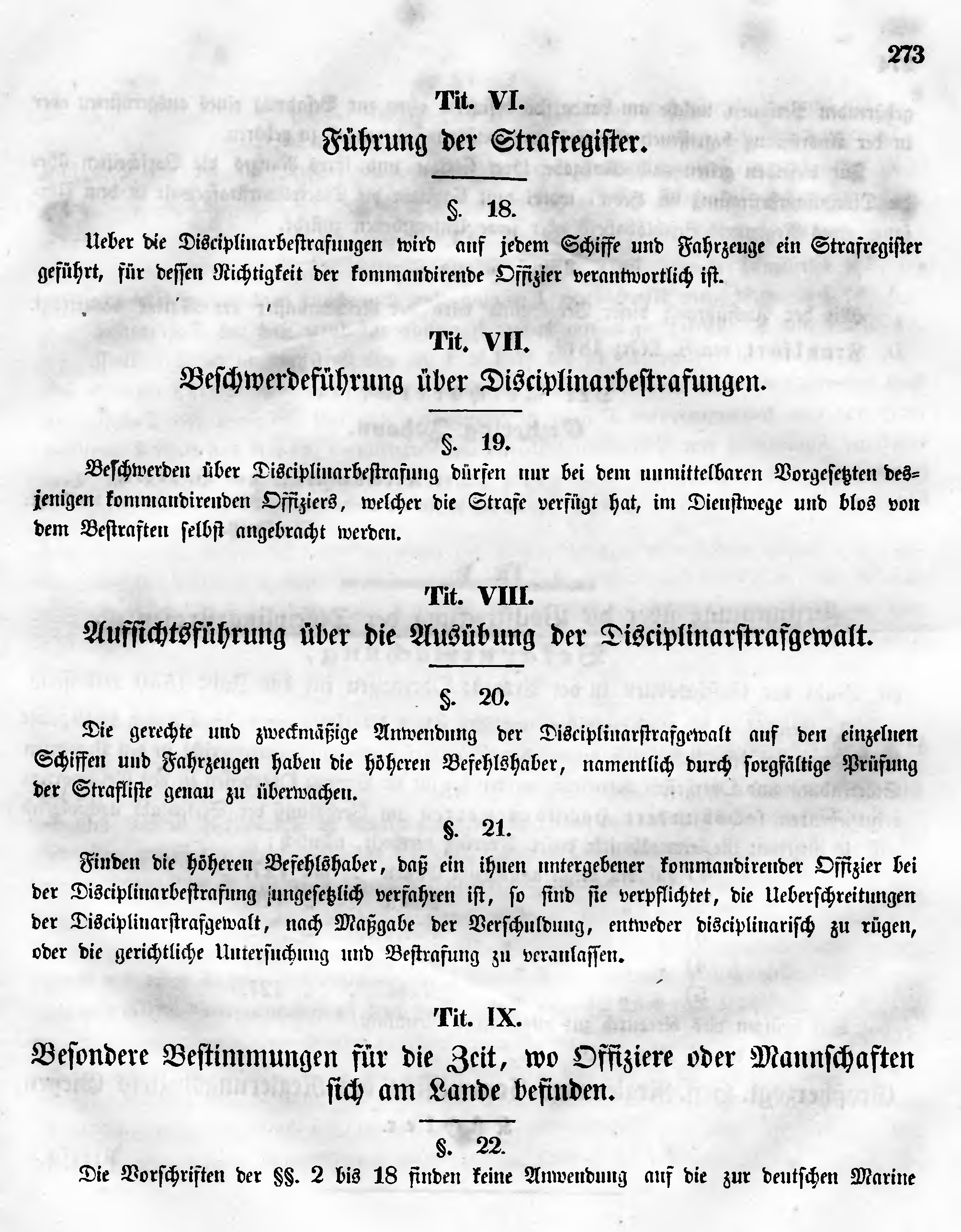 Die gerechte und zweckmäßige Anwendung der Disciplinarstrafgewalt auf den einzelnen Schiffen und Fahrzeugen haben die höheren Befehlshaber, namentlich durch sorgfältige Prüfung der Strafliste genau zu überwachen.