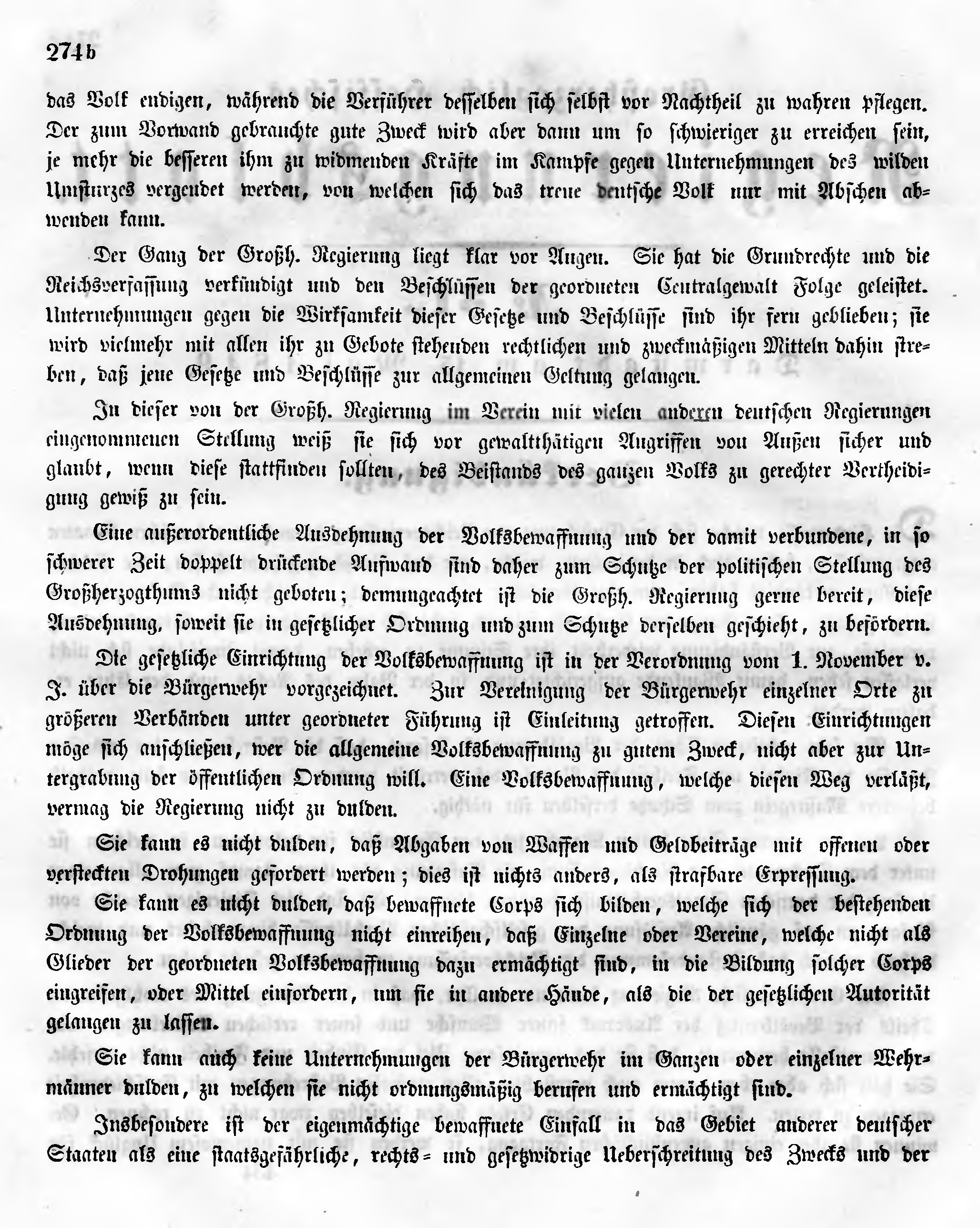 Sie kann es nicht dulden, daß bewaffnete Corps sich bilden, welche sich der bestehenden Ordnung der Volksbewaffnung nicht einreihen, daß Einzelne oder Vereine, welche nicht als Glieder der geordneten Volksbewaffnung dazu ermächtigt sind, in die Bildung solcher Corps eingreifen, oder Mittel einfordern, um sie in andere Hände, als die der gesetzlichen Autorität gelangen zu lassen.