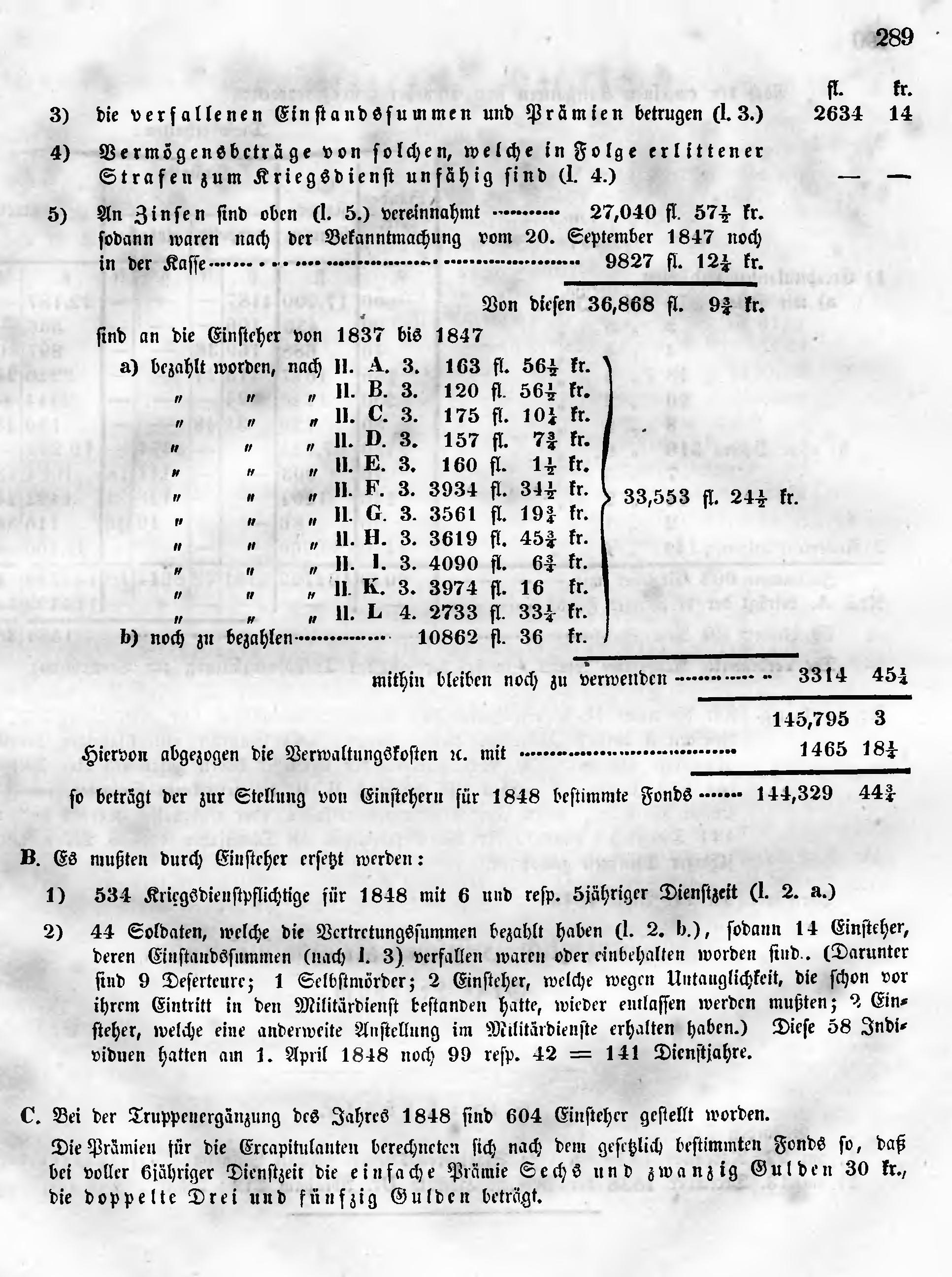 | so beträgt der zur Stellung von Einstehern für 1848 bestimmte Fond | 144,329 | 44 ¾ | |||||