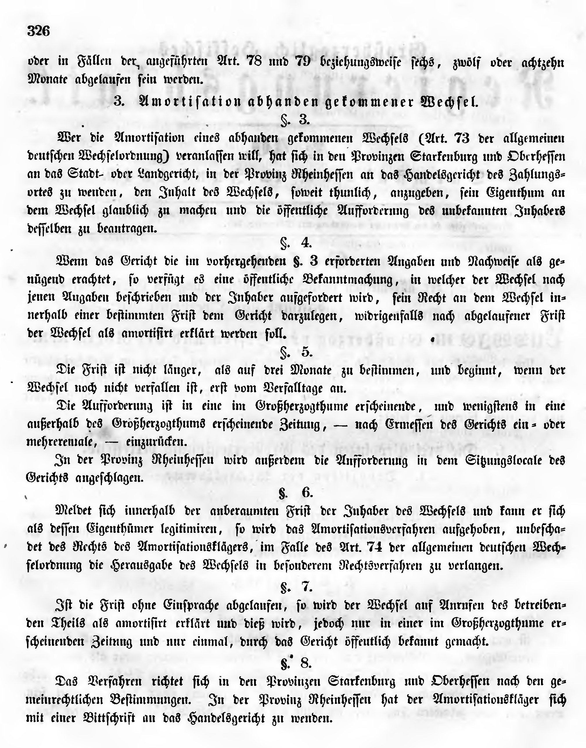 Wer die Amortisation eines abhanden gekommenen Wechsels (Art. 73 der allgemeinen deutschen Wechselordnung) veranlassen will, hat sich in den Provinzen Starkenburg und Oberhessen an das Stadt- oder Landgericht, in der Provinz Rheinhessen an das Handelsgerichts des Zahlungsortes zu wenden, den Inhalt des Wechsels, soweit thunlich, anzugeben, sein Eigenthum an dem Wechsel glaublich zu machen und die öffentliche Aufforderung des unbekannten Inhabers desselben zu beantragen.