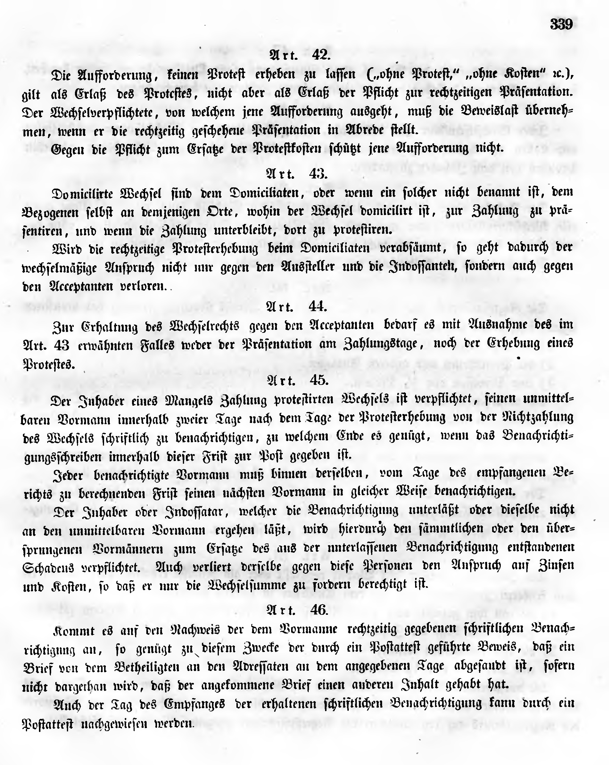 Zur Erhaltung des Wechselrechts gegen den Acceptanten bedarf es mit Ausnahme des im Art. 43 erwähnten Falles weder der Präsentation am Zahlungstage, noch der Erhebung eines Protestes.