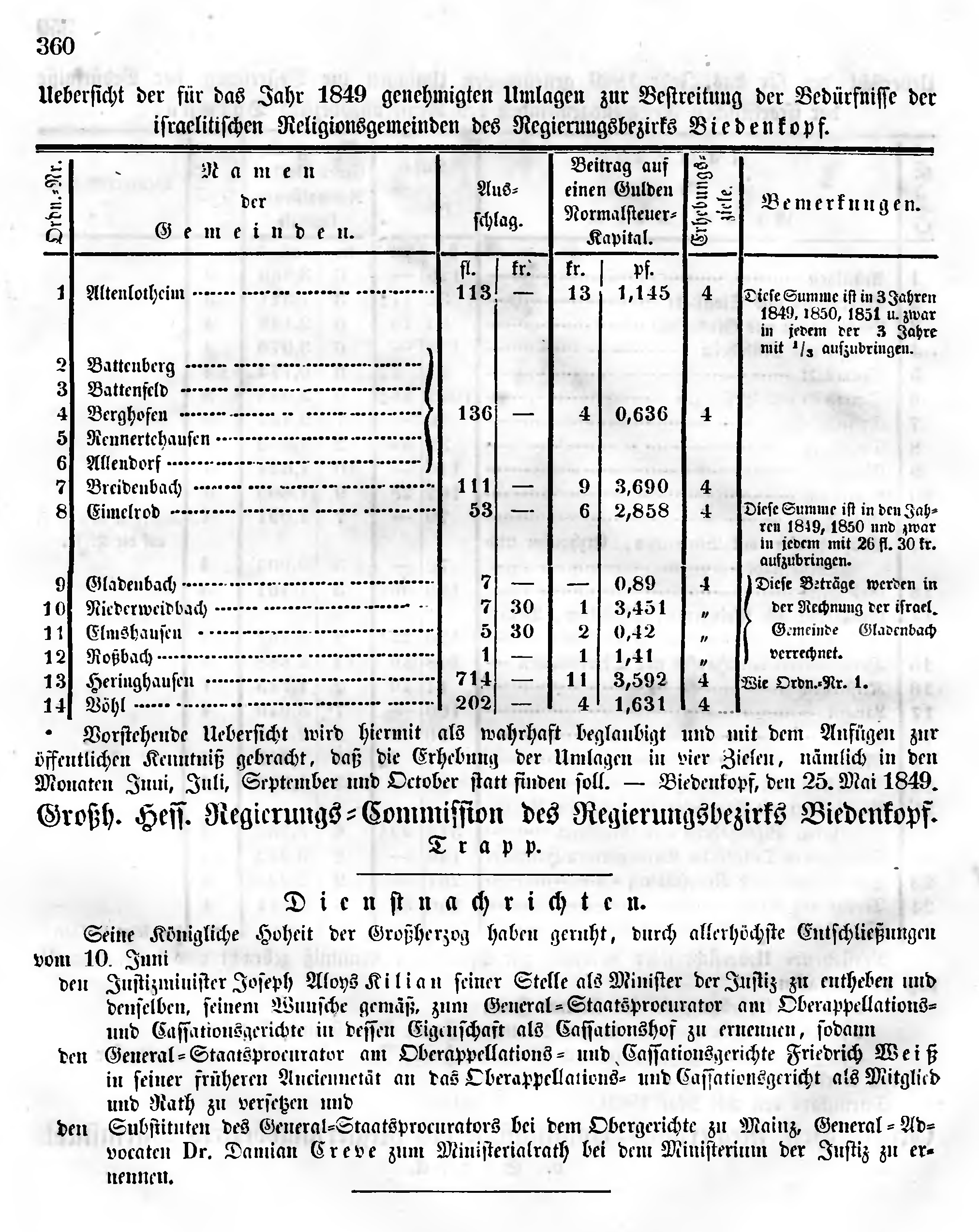 Erhebung der Umlagen in vier Zielen, nämlich in den Monaten Juni, Juli, September und October statt finden soll. - Biedenkopf, den 25. Mai 1849.