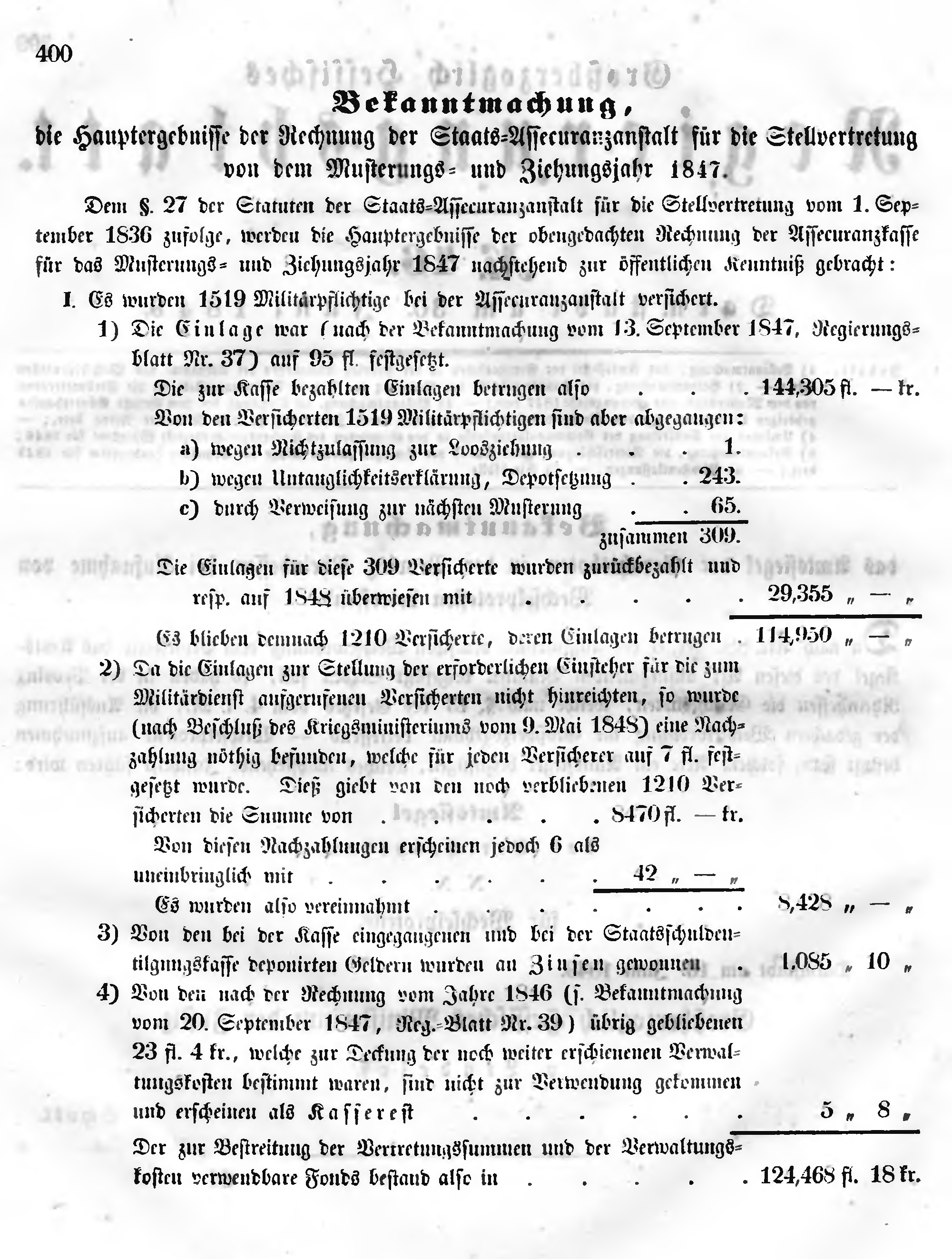 Dem §. 27 der Statuten der Staats-Assecuranzanstalt für die Stellvertretung vom 1. September 1836 zufolge, werden die Hauptergebnisse der obengedachten Rechnung der Assecuranzkasse für das Musterungs- und Ziehungsjahr 1847 nachstehend zur öffentlichen Kenntniß gebracht: