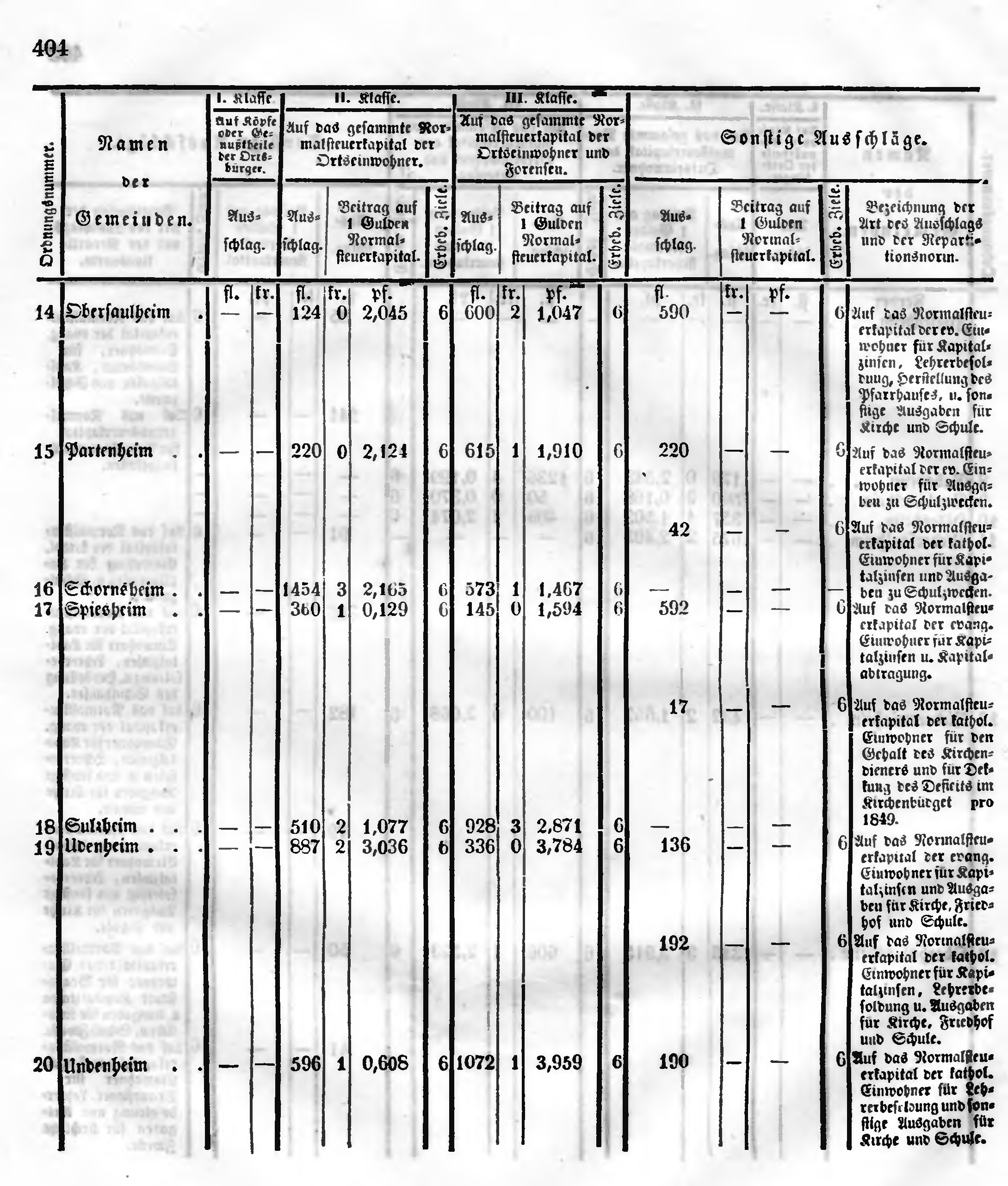 Auf das Normalsteu- erkapital der ev. Ein- wohner für Kapital- zinsen, Lehrerbesol- dung, Herstellung des Pfarrhauses, u. son- stige Ausgaben für Kirche und Schule. Auf das Normalsteu- erkapital der ev. Ein- wohner für Ausga- ben zu Schulzwecken. Auf das Normalsteu- erkapital der kathol. Einwohner für Kapi- talzinsen und Ausga- den zu Schulzwecken. Auf das Normalsteu- erkapital der evang. Einwohner für Kapi- talzinsen u. Kapital- abtragung. Auf das Normalsteu- erlapital der kathol. Einwohner für den Gehalt des Kirchen- dieners und für Dec- kung des Deficits im Kirchenbüdget pro 1849. Auf das Normalsteu- erkapital der evang. Einwohner für Kapi- talzinsen und Ausga- ben für Kirche, Fried- hof und Schule. Auf das Normalsteu- erkapital der kathol. Einwohner für Kapi- talzinsen, Lehrerbe- soldung u. Ausgaben für Kirche, Friedhof und Schule. Auf das Normalsteu- erkapital der kathol. Einwohner für Leh- rerbesoldung und son- stige Ausgaben für Kirche und Schule. |
