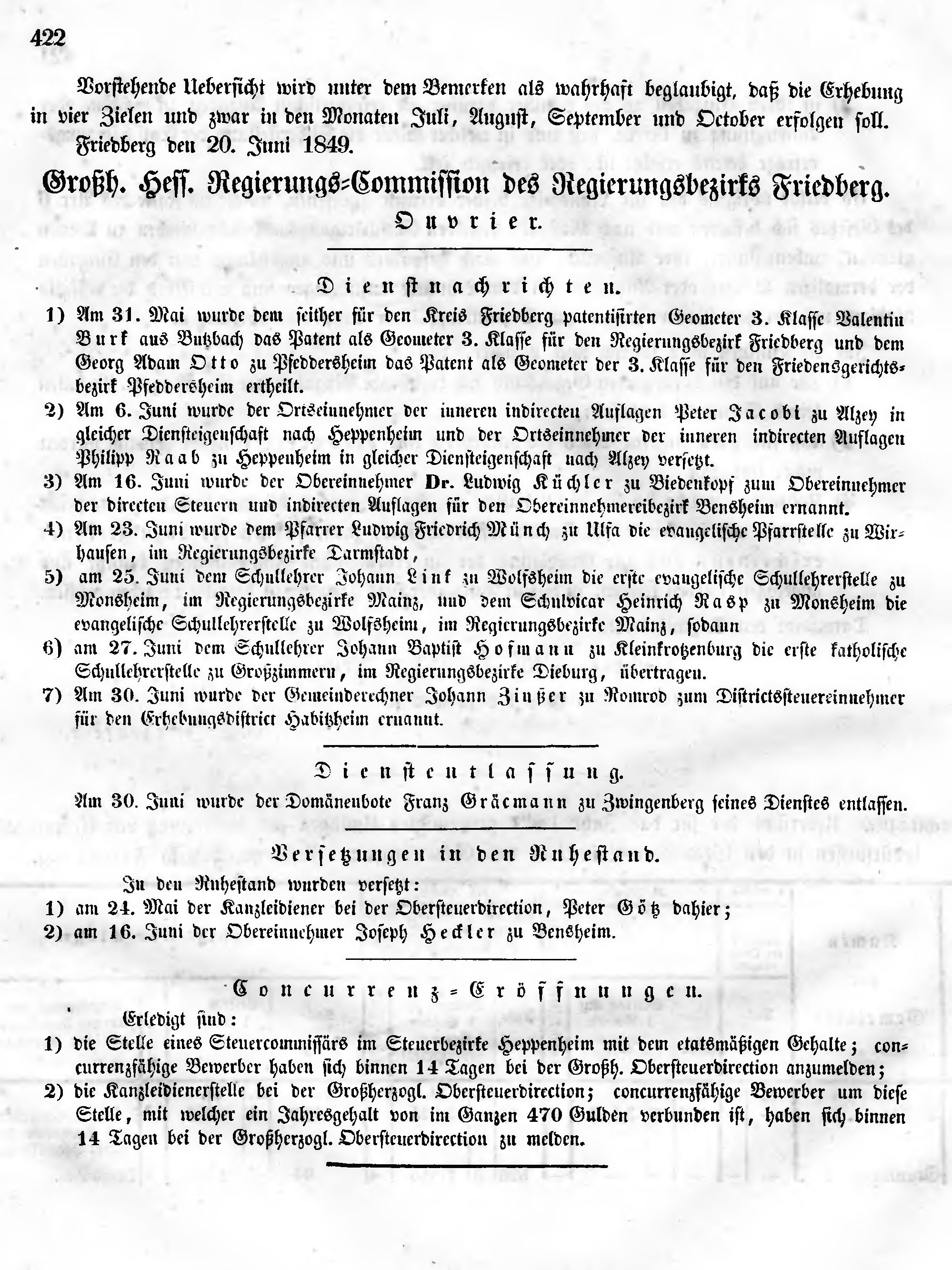 3) Am 16. Juni wurde der Obereinnehmer Dr. Ludwig Küchler zu Biedenkopf zum Obereinnehmer der directen Steuern und indirecten Auflagen für den Obereinnehmereibezirk Bensheim ernannt.